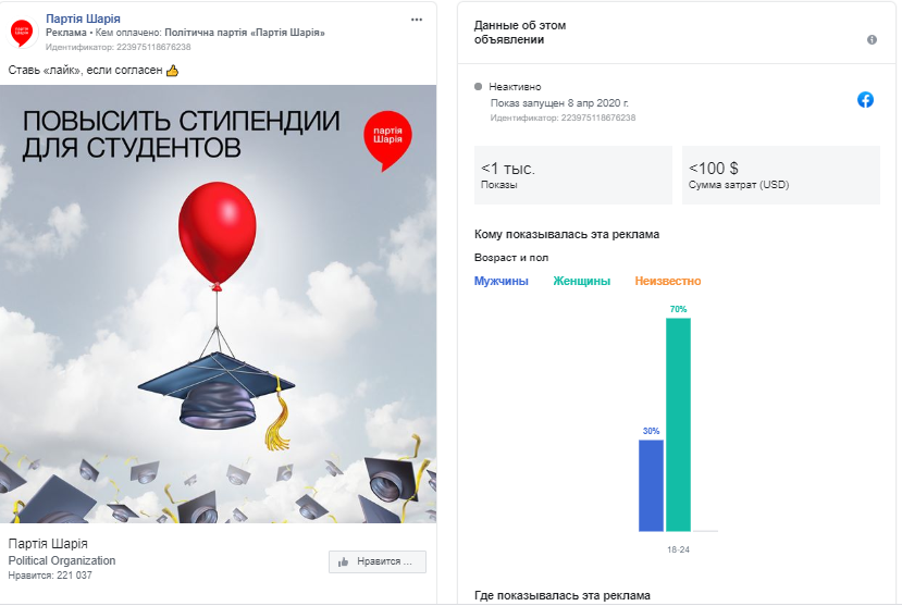 І третя партія, яка таргетувала свою рекламу на Миколаївську область, була Партія Шарія. Реклама була запущена 8 квітня і охопила до 1 тис. мешканців. Партія таргетувала мешканців виключно 18-24 років, тобто дане оголошення направлено на студентів, адже стосується підвищення стипендій. Хоча якщо взяти рекламні оголошення партії в нашій області починаючи з січня 2019 року, то можна побачити що основний ухил був на аудиторію жінок 25-44 років.