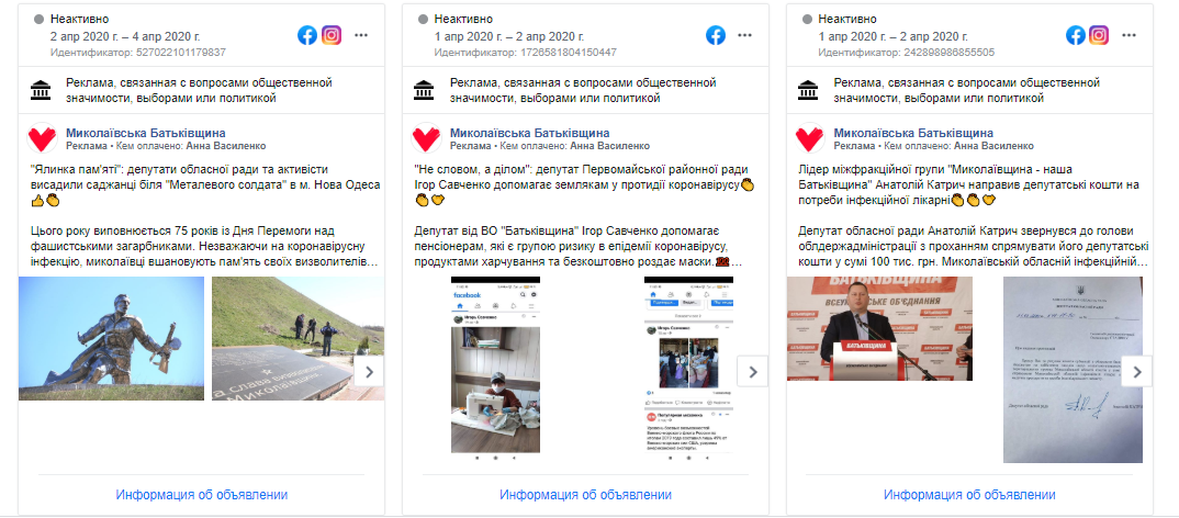 Найбільше за даний період було запущено рекламних оголошень Миколаївською обласною організацією ВО “Батьківщина”. Реклама партії охопила приблизно від 174 тис. до 240 тис. мешканців нашої області, 20% з яких жінки віком 55-64. Також, сервіс показує, що рекламних оголошень партій було багато, але по часу кожна з них рекламувалась у середньому два дні. Бібліотека реклами фейсбуку показує, що починаючи з червня 2019 року загалом сторінка партії витратила на рекламу 1776 американських доларів.