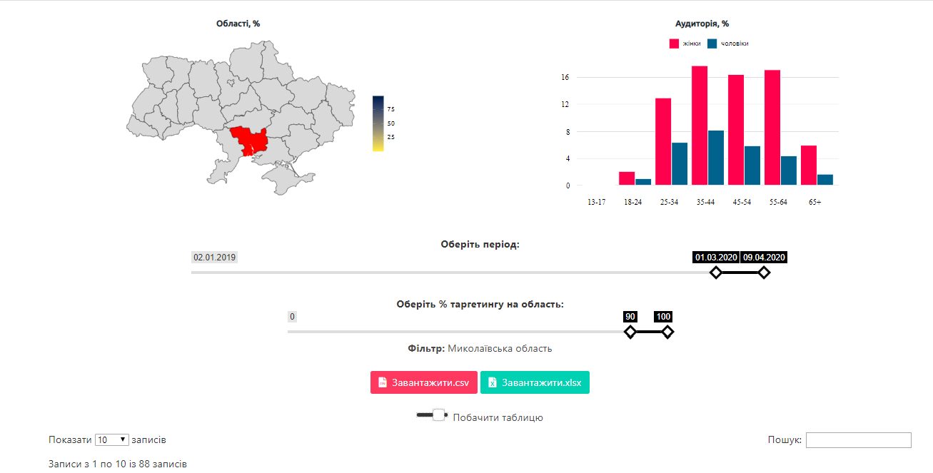 Так, сервіс показує, що за останній місяць в області було запущено 88 рекламних оголошень, основною аудиторією яких стали жінки від 25 до 64 років.