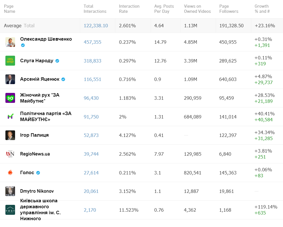 Найбільше користувачі взаємодіяли (залишали реакції та коментували) з постами на  сторінках Олександра Шевченка, "Слуги народу" та Арсенія Яценюка.