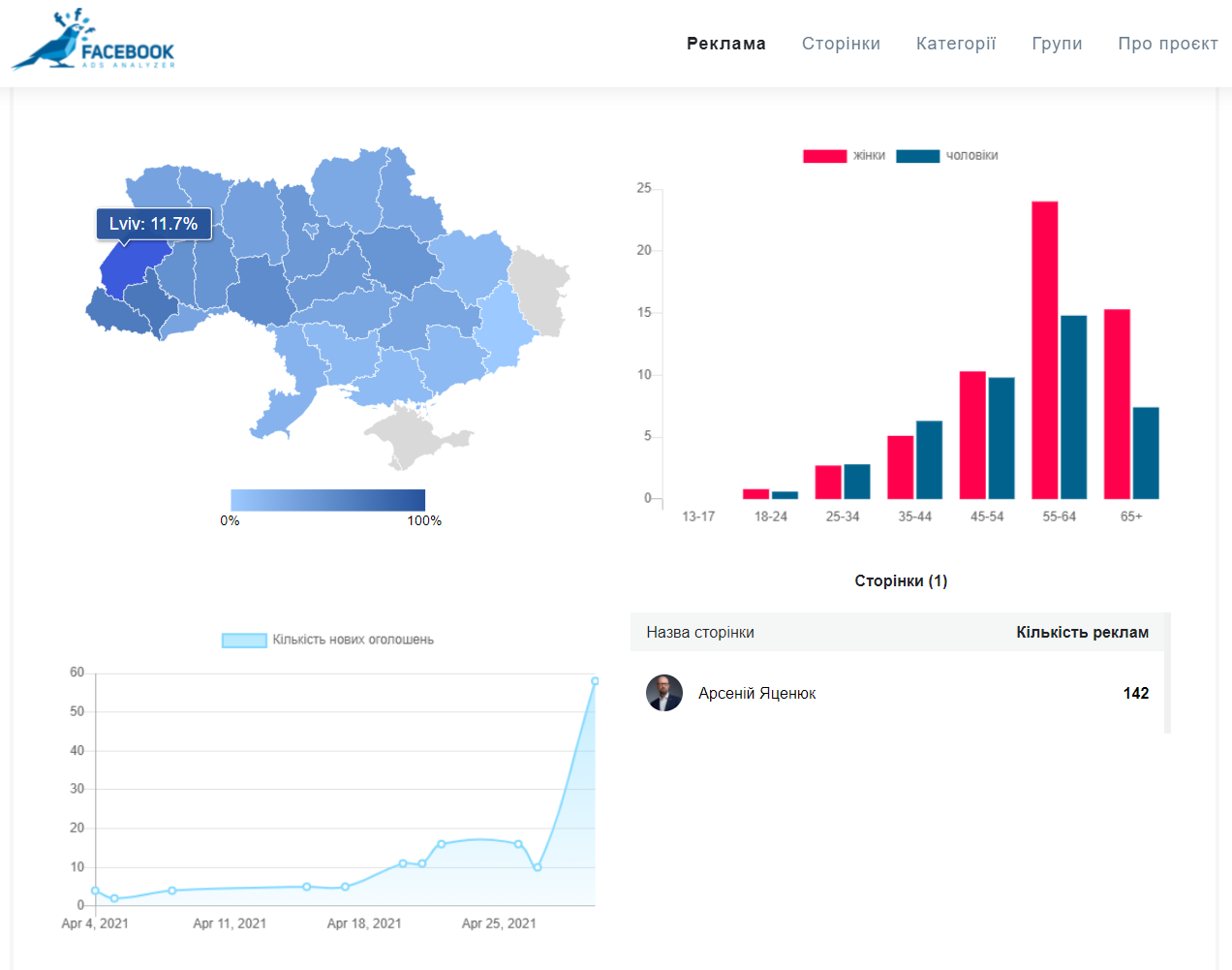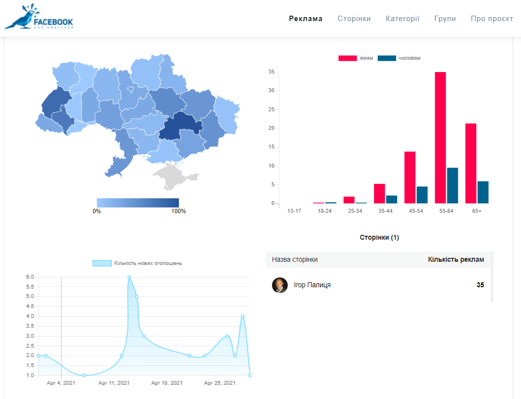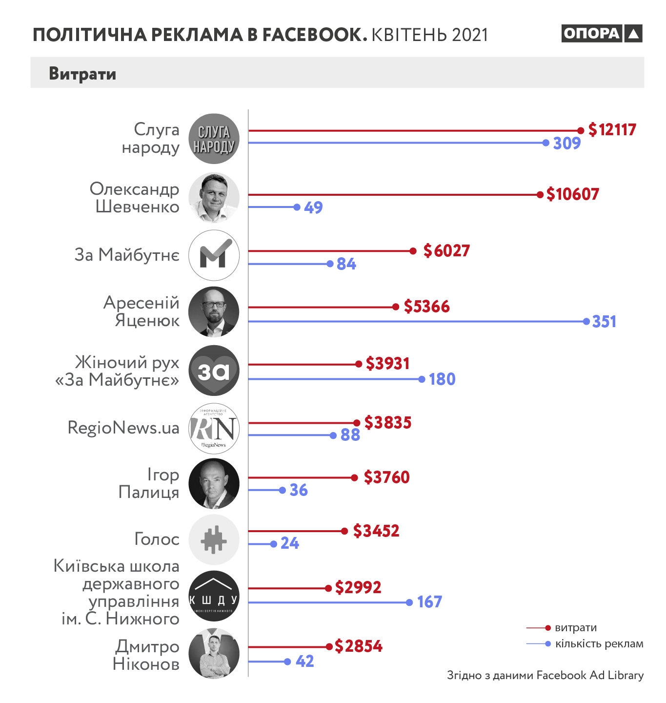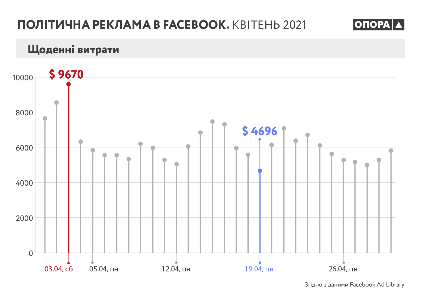 Так, у квітні 2021 року на трансляцію 10 227 рекламних дописів політичного змісту з 1 324 сторінок у Facebook було витрачено від 174 390 до 276 310 доларів*. 5,6% рекламних публікацій  політичного змісту не містили маркування, якого вимагають правила соцмережі. Водночас показники цього року мають незначну різницю з попереднім. У квітні 2020 року на рекламу політичного контенту в мережі було витрачено  від 121 538 до 204 599 американських доларів.