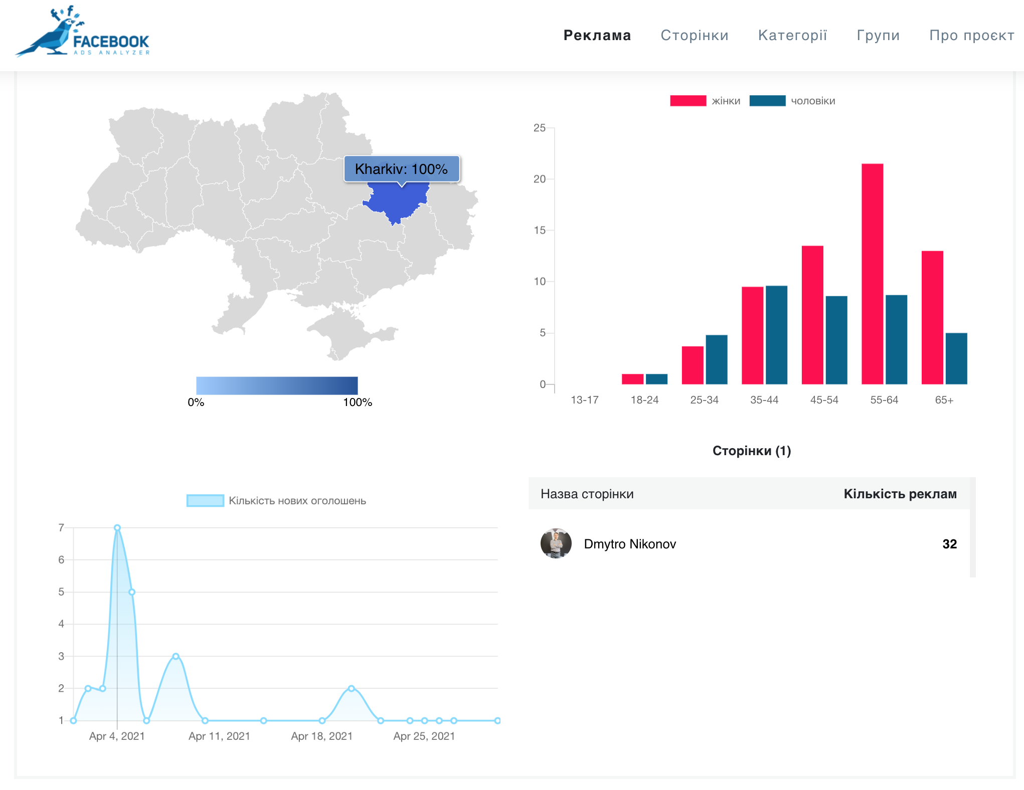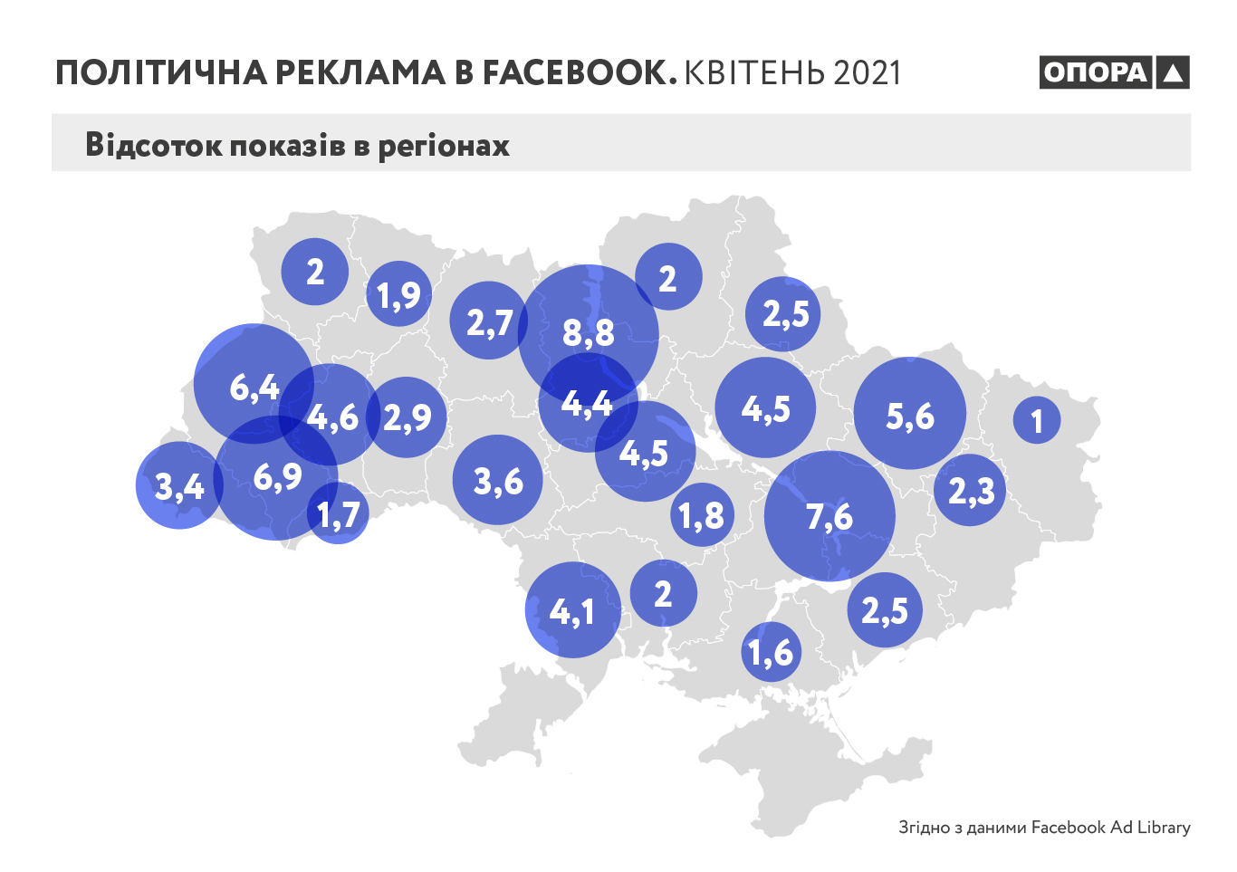 Завершення виборчих кампаній в одномандатних виборчих округах повертає киян на першу позицію серед найбажаніших для рекламодавців отримувачів політичної реклами. У квітні аудиторія жителів столиці у відсотковому розподілі показів  склала 8,8%. Також у фокусі замовників промоції в Facebook жителі регіонів, де висока частка користувачів соцмереж, а саме Львівщини (6,4%) та Дніпропетровщини (7,6%). Однак суперечливі обставити встановлення результатів та визнання переможця проміжних виборів народного депутата в окрузі №87 відображаються у стабільно високому зацікавленні в увазі користувачів з Івано-Франківщини (6,9%). Найбільша частка рекламного контенту у квітні пропонувалася жіночій аудиторії 55 – 64 років, тоді як серед чоловічої аудиторії найбільший інтерес для рекламодавців становили користувачі, які вказали у свої профілях вік 35 –  44 роки.