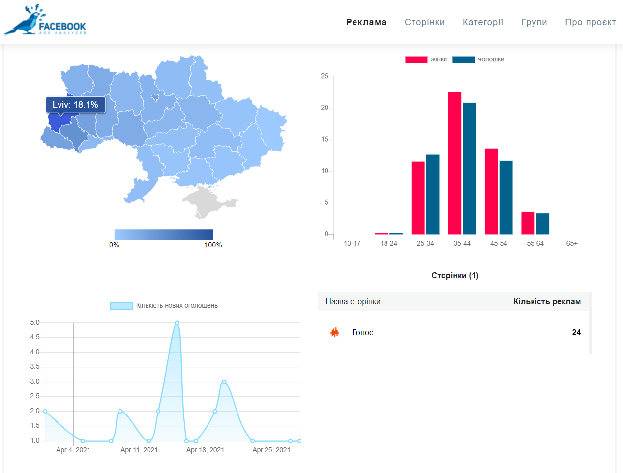 3 452 доларів інвестували в рекламу зі сторінки політичної партії Голос, зі значною перевагою показів для користувачів з Львівщини (18,1%). З 24 платних публікацій значна частина стосувалася  реклами антикризового економічного плану для України,  критики антиковідної політики влади, реалізації програми вакцинації, а також зовнішньої політики України. Цільова аудиторія реклами — вікова група 35 — 44 років.