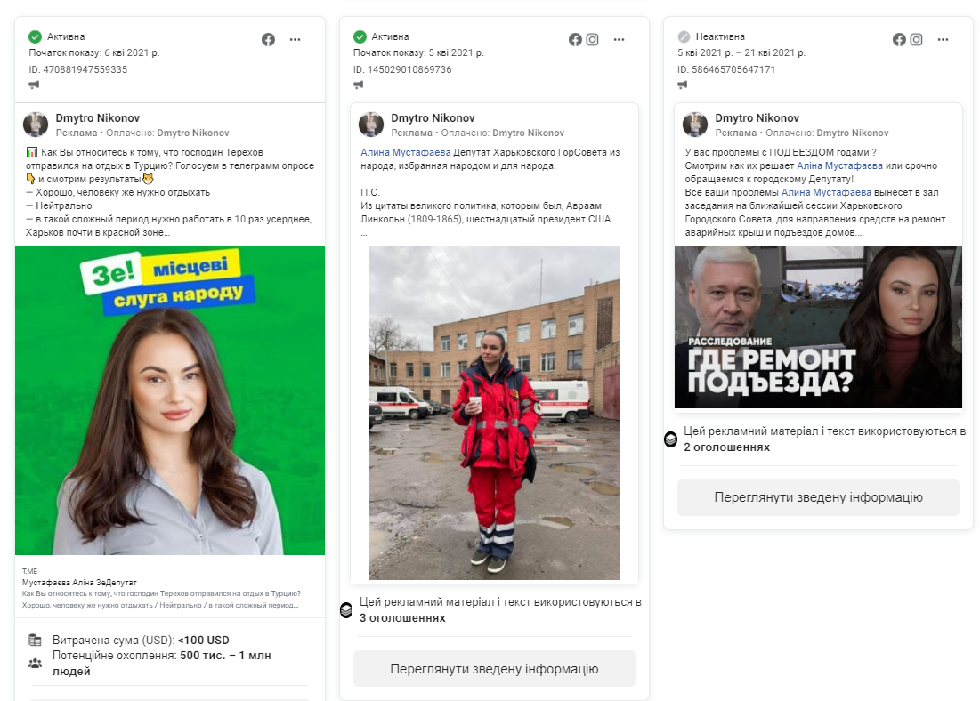 Як і в січні, серед лідерів за витратами опинилася і сторінка харківського підприємця Дмитра Ніконова, який протягом місяця розмістив 42 рекламні публікації, що піарили діяльності депутатки харківської міської ради від партії “Слуга народу” Аліни Мустафаєвої. У дисклеймері зазначено, що рекламу оплачує особисто Дмитро Ніконов. У контактах рекламодавця зазначений сайт автосалону електроавтомобілів, співвласником та засновником якого є підприємець, та його робоча скринька. На поширення рекламних постів серед жителів Харківщини було використано 2 854 долари.  У рекламних публікаціях промоція Youtube-каналу депутатки, висвітлення її діяльності та критика міської влади, зокрема секретаря міськради Ігоря Терехова.