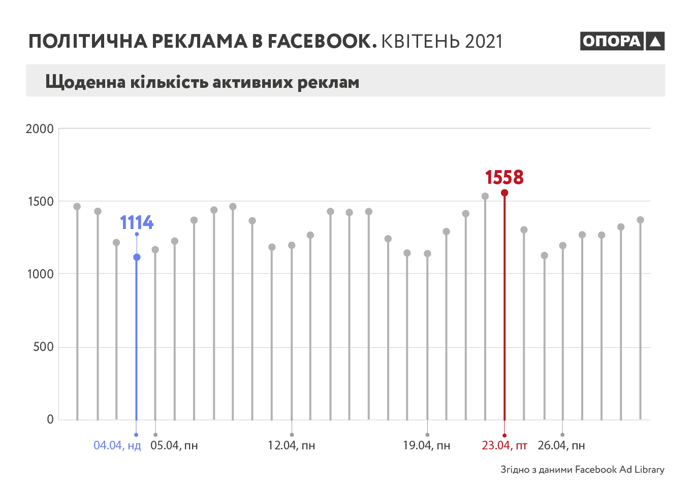 У період відсутності загальнонаціональних виборчих кампаній кількість активних користувачів політичної фейсбук-реклами в Україні порівняно невелика — до півтори тисячі сторінок, які просувають дещо більше 10 000 рекламних публікацій.