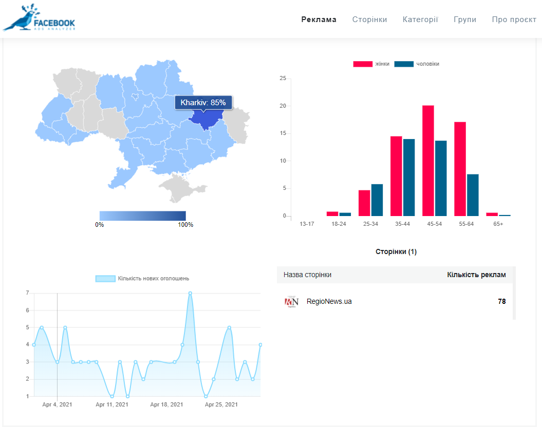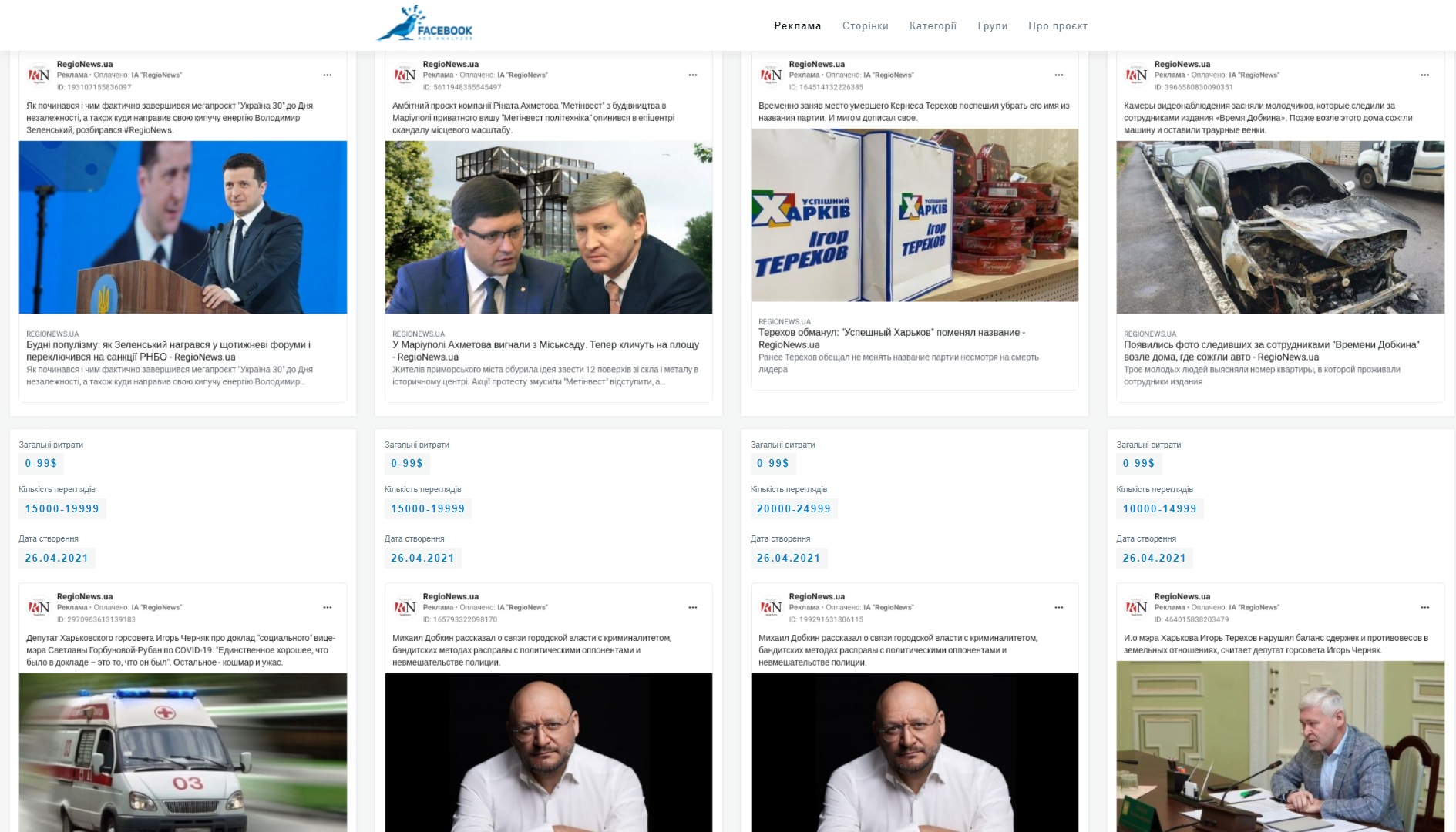 Здебільшого на користувачів з Харківської області (85% показів) орієнтована реклама зі сторінки всеукраїнського інформаційного агенства  RegioNews.ua (зареєстроване Міністерством юстиції України 16 лютого 2011 року). У постах, які рекламують публікації з сайту регіонального спрямування, найчастіше згадуються імена двох політиків Михайла Добкіна (в нейтральному світлі) та Ігоря Терехова (критика його політики та рішень місцевої влади). Зауважимо, що вибори міського голови Харкова призначені на жовтень 2021 року.  Реклама матеріалів видання також частково транслюється і на інші регіони — але середнє значення менш як 1% показів. Вартість жодного рекламного оголошення на сторінці, а їх  у квітні було 88, не перевищувала 100 доларів.