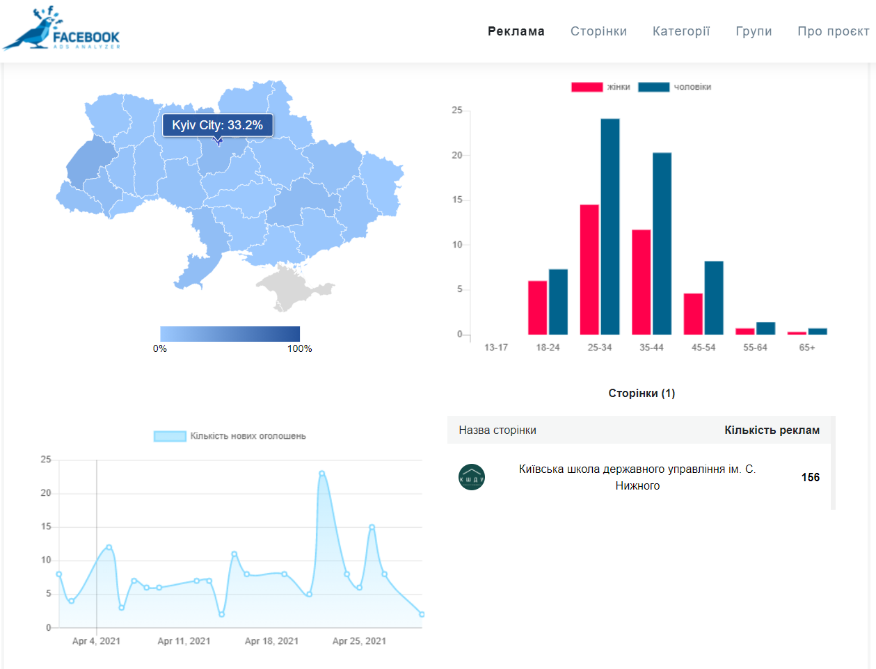До десятки найбільших рекламодавців квітня увійшла сторінка Київської школи державного управління ім. С. Нижного, створена 16 лютого 2021 року. Загальні витрати сторінки на рекламу з моменту створення 3 750 $, з них у квітні — 2 992 на оплату 167 рекламних постів. Реклама на сторінці таргетувалася на жителів всіх регіонів, окремо виділивши киян — 33,2%. Сторінка публікує промо навчальних курсів.