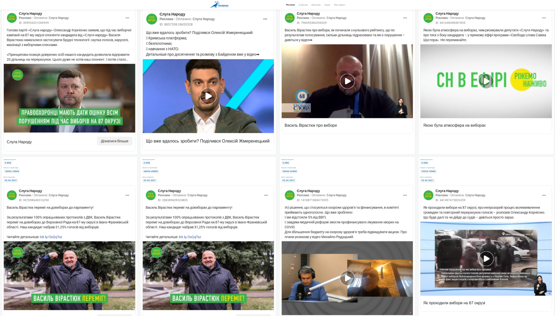 Найбільша сума на політичну рекламу в Facebook використана зі сторінки політичної партії “Слуга Народа”, яка веде активний та сталий піар в соцмережах. У квітні на сторінці рекламувалося 309 публікацій, з них 260 розміщених у квітні, загальною вартістю 12 117 доларів. І хоча рекламна стратегія сторінки працює на всі регіони Україні, у квітні значна частина показів політичних платних публікацій була налаштована на користувачів з Івано-Франківщини.   У рекламних публікаціях на сторінці розповідалося про ініціативи партійців у Верховній Раді, роботу представників політсили в регіоні, інформувалося про ініціативи та діяльність влади. Щонайменше 22 публікації були присвячені виборам народного депутата в окрузі № 87.