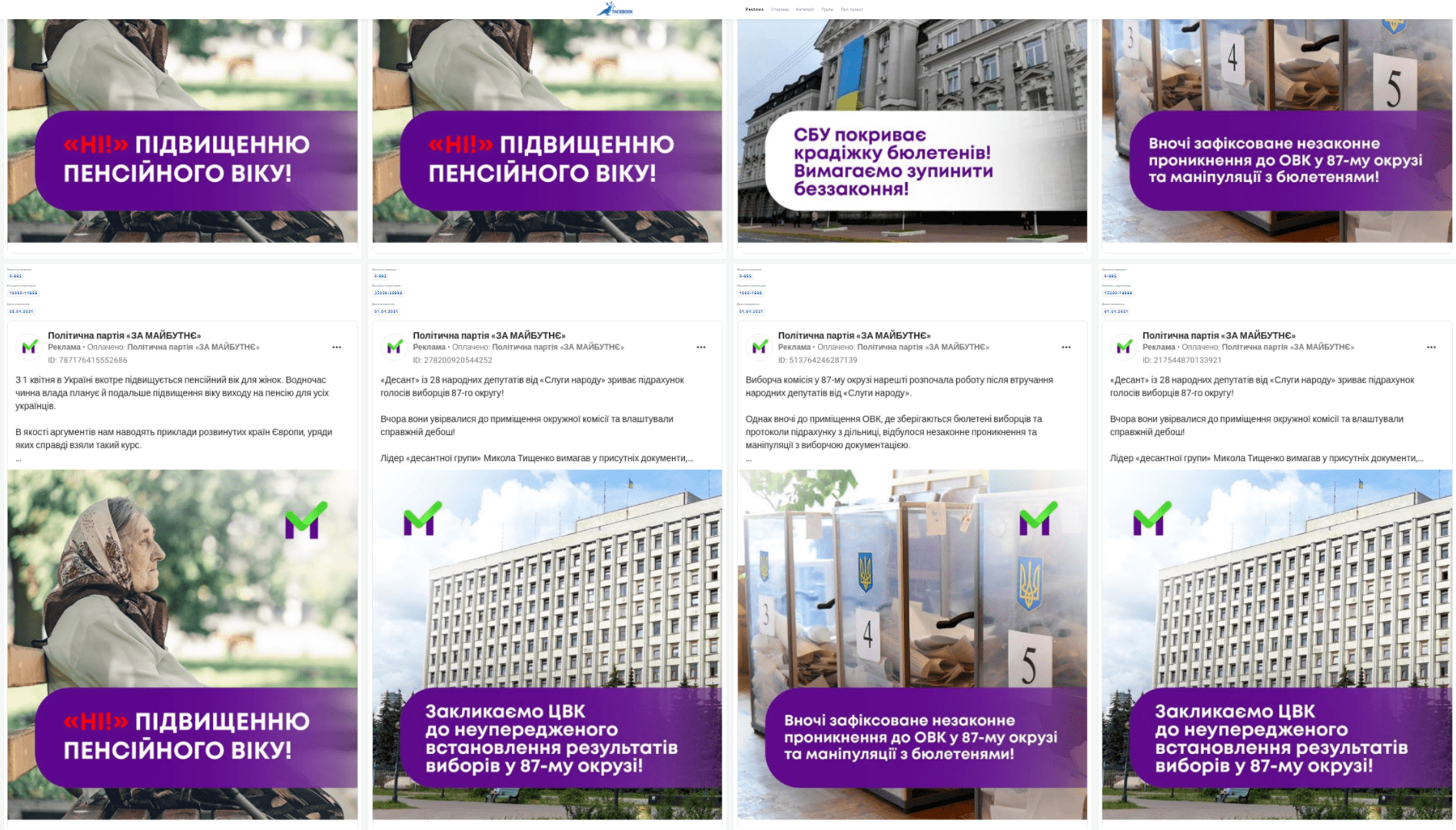 Замикає трійку сторінок з найбільшою кількістю витрат на політичну рекламу  офіційна сторінка партії “За майбутнє, яка фактично є найбільшим рекламодавцем місяця. У квітні на центральній сторінці партії за рекламу 84 публікацій було сплачено 6 027 доларів. Рекламний контент сторінки поширювався на всі регіони країни, з акцентом на Дніпропетровщину (7,8%), Львівщину (6,9%) та Івано-Франківщину (7%). Основна частина реклами була налаштовна на покази аудиторії 55 років і старше. Нагадаємо, що в останньому регіоні кандидував на довиборах у Верховну Раду висуванець партії Олександр Шевченко. Саме темі встановленню результатів цих виборів було присвячено низку постів на початку місяця, які таргетувалися на всі регіони України. Загальна ж рекламна стратегія сторінки присвячена висвітленню позиції партійців щодо важливих суспільно-економічних та політичних питань.