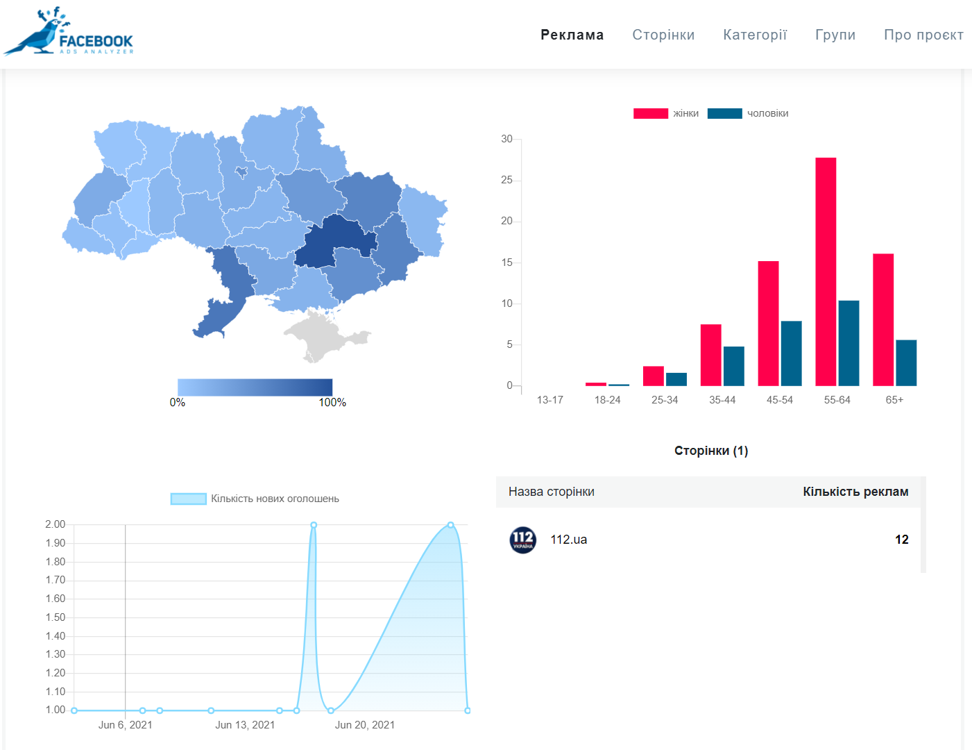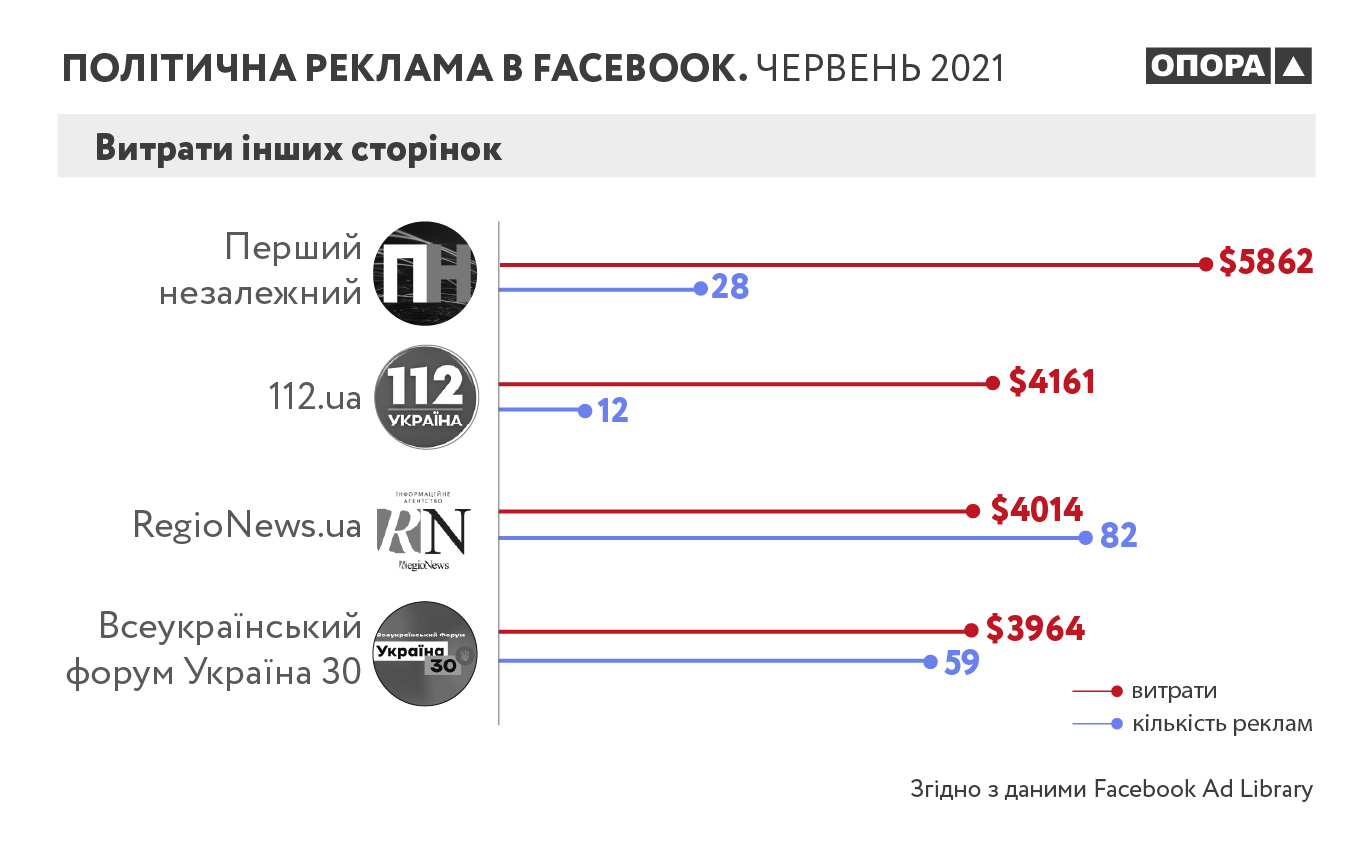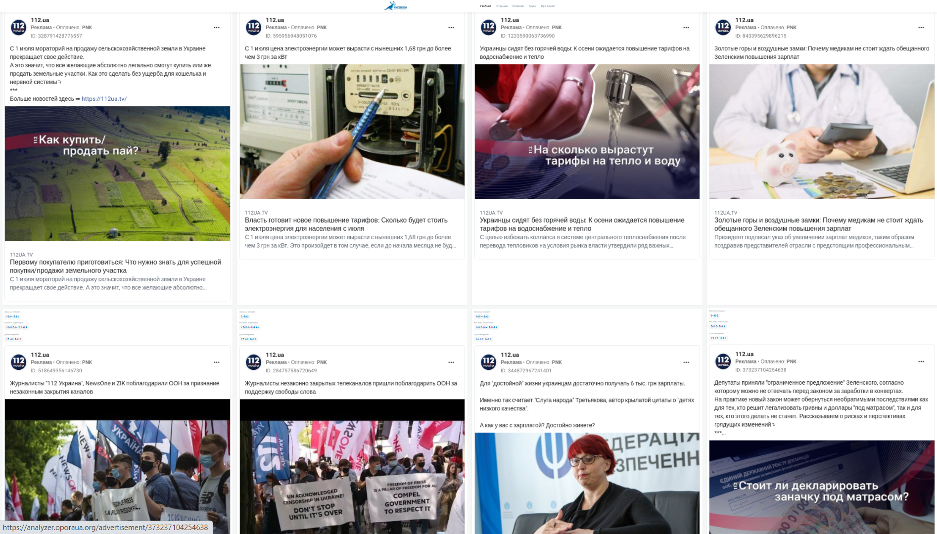 У червні серед найбільших рекламодавців місяця також опинилася сторінка телеканалу 112.ua — 4 161 долар на промо 12 оголошень. Як зазначається у застереженні, рекламу на сторінці оплачує PNK, тобто Перший незалежний канал (https://pnk.tv).  У частину публікацій на сторінці було інвестовано від 300 до 600 доларів, найбільше в рекламний пост щодо пенсійного віку — 2 — 2,5 тисяч доларів.  Як зафіксувала ОПОРА, одразу після введення у дію рішення РНБО про запровадження санкцій проти одного з депутатів “Опозиційної платформи – За життя” Тараса Козака (серед обмежувальних заходів – закриття низки телеканалів, якими він володів), 112.ua значно активізувався на платформах соцмереж, зокрема Facebook.