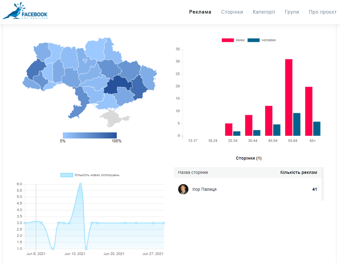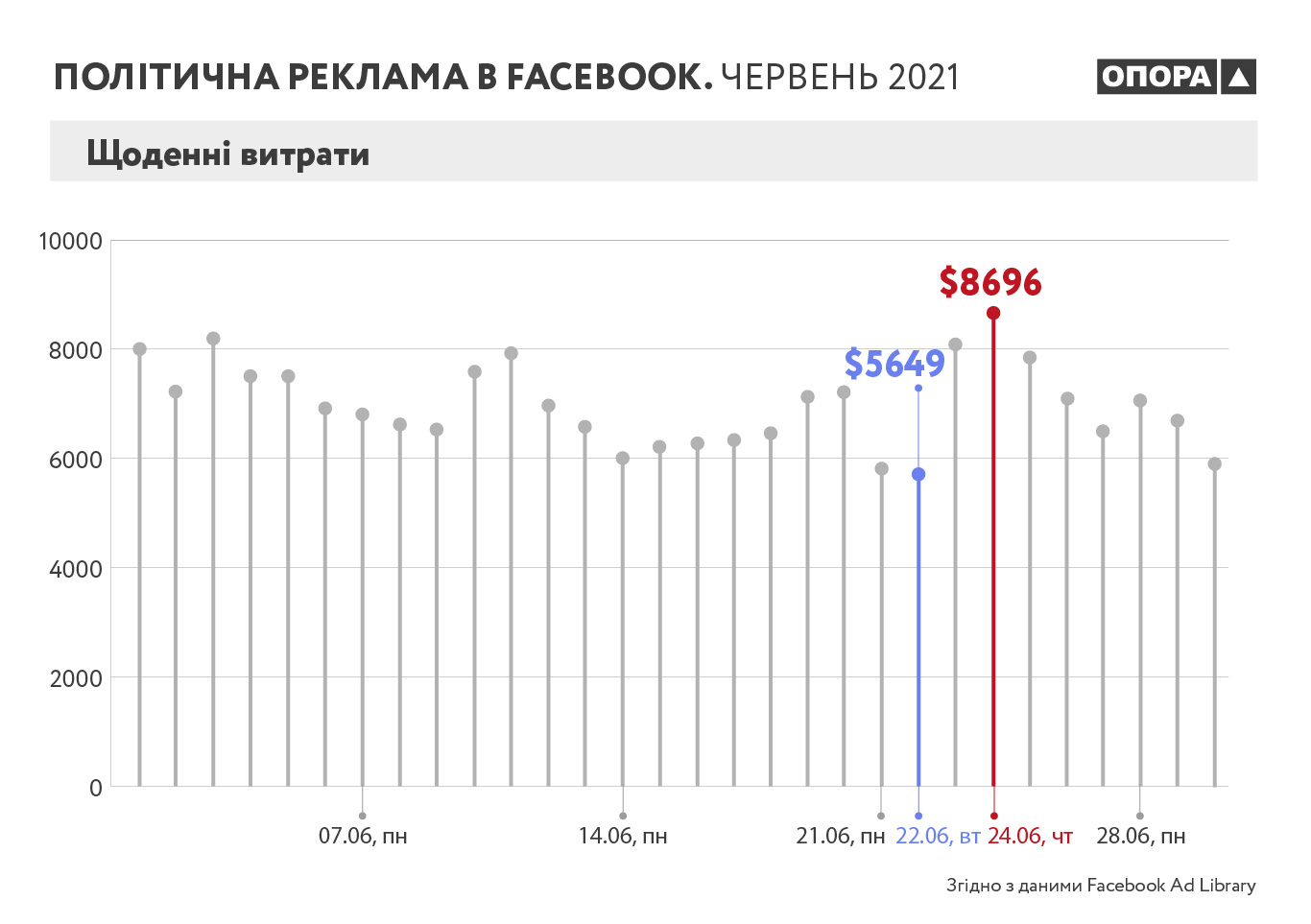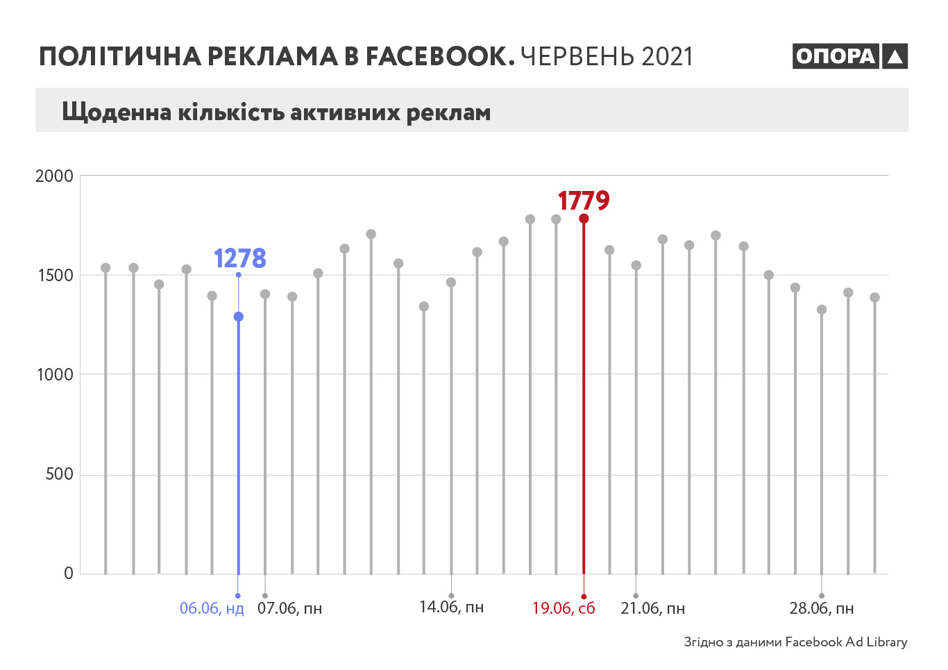 Протягом першого місяця літа зі сторінок українських політиків та партій, а також дотичних до політики акаунтів транслювалося 11 257 рекламних дописів. Загалом у просування політичного контенту було інвестовано від 209 126 до 317 234 доларів*. За аналогічний період минулого року, відповідно до даних Facebook Ad Library Report, всі показники були нижчі: на політичний піар за допомогою Facebook-реклами було витрачено від 178 933 до 273 973 $. Хоча правила маркування політичної реклами запроваджені у Facebook вже два роки, досі залишаються ті, хто їх ігнорують. Так, 6,7% рекламних оголошень у червні не містили позначки “політична реклама”.