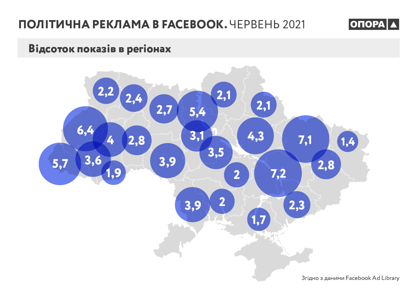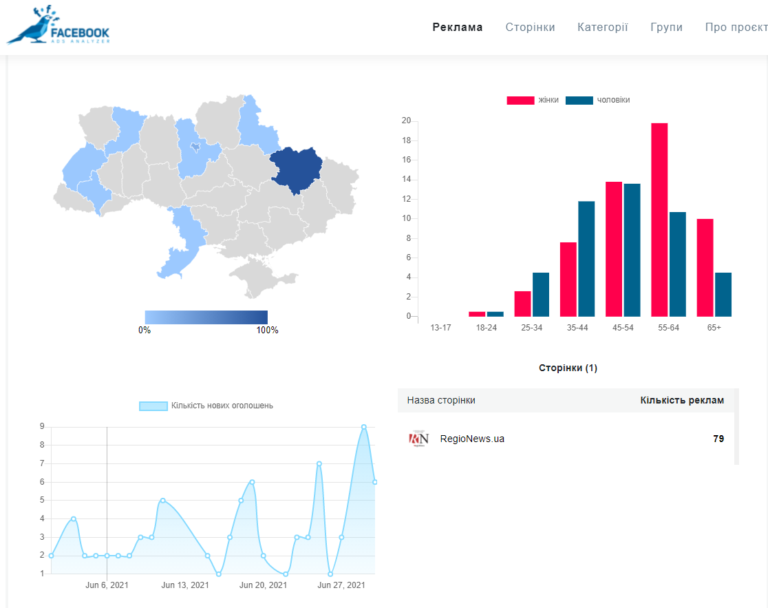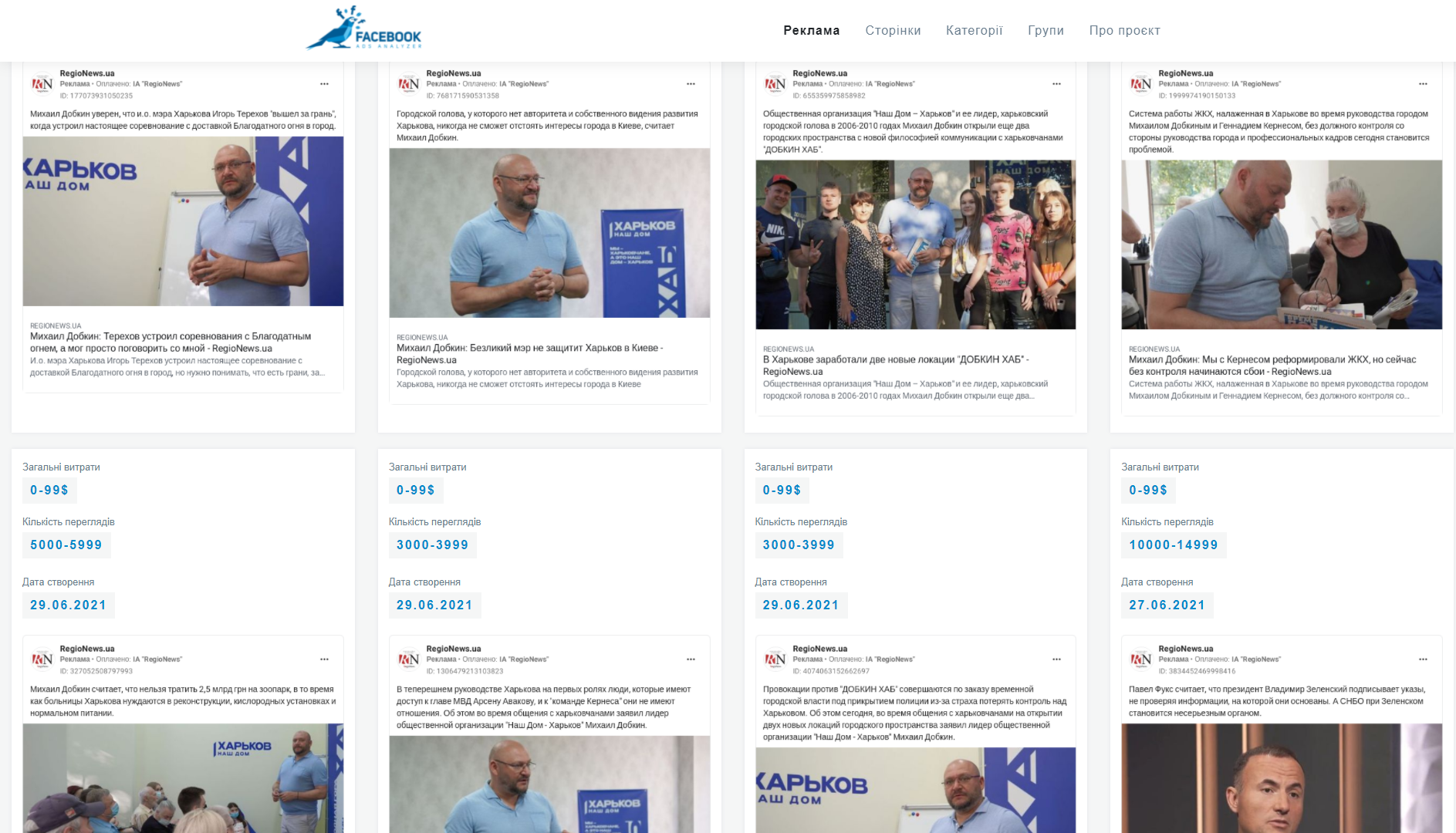 Значний пріоритет для рекламодавців на сторінці всеукраїнського інформаційного агентства  RegioNews.ua становили користувачі з Харківщини, де протягом червня на рекламу 82 оголошень було витрачено 4 014 $. Частина з цих публікацій розповідає про ініціативи та позиції потенційного учасника змагань за крісло міського голови Михайла Добкіна, а його ймовірні опоненти критикуються.  Як і у травні, реклама зі сторінки не транслювалася на всі регіони України, 80% показів було налаштовано для користувачів Харківської області.