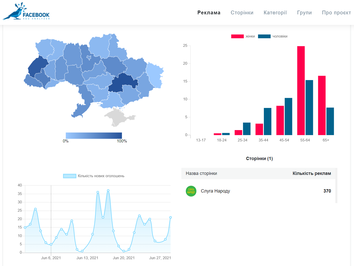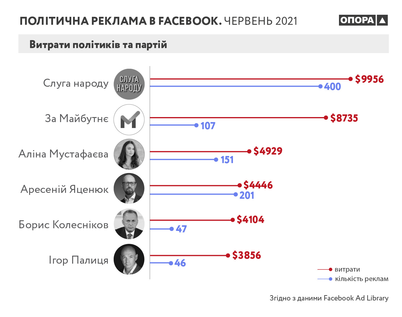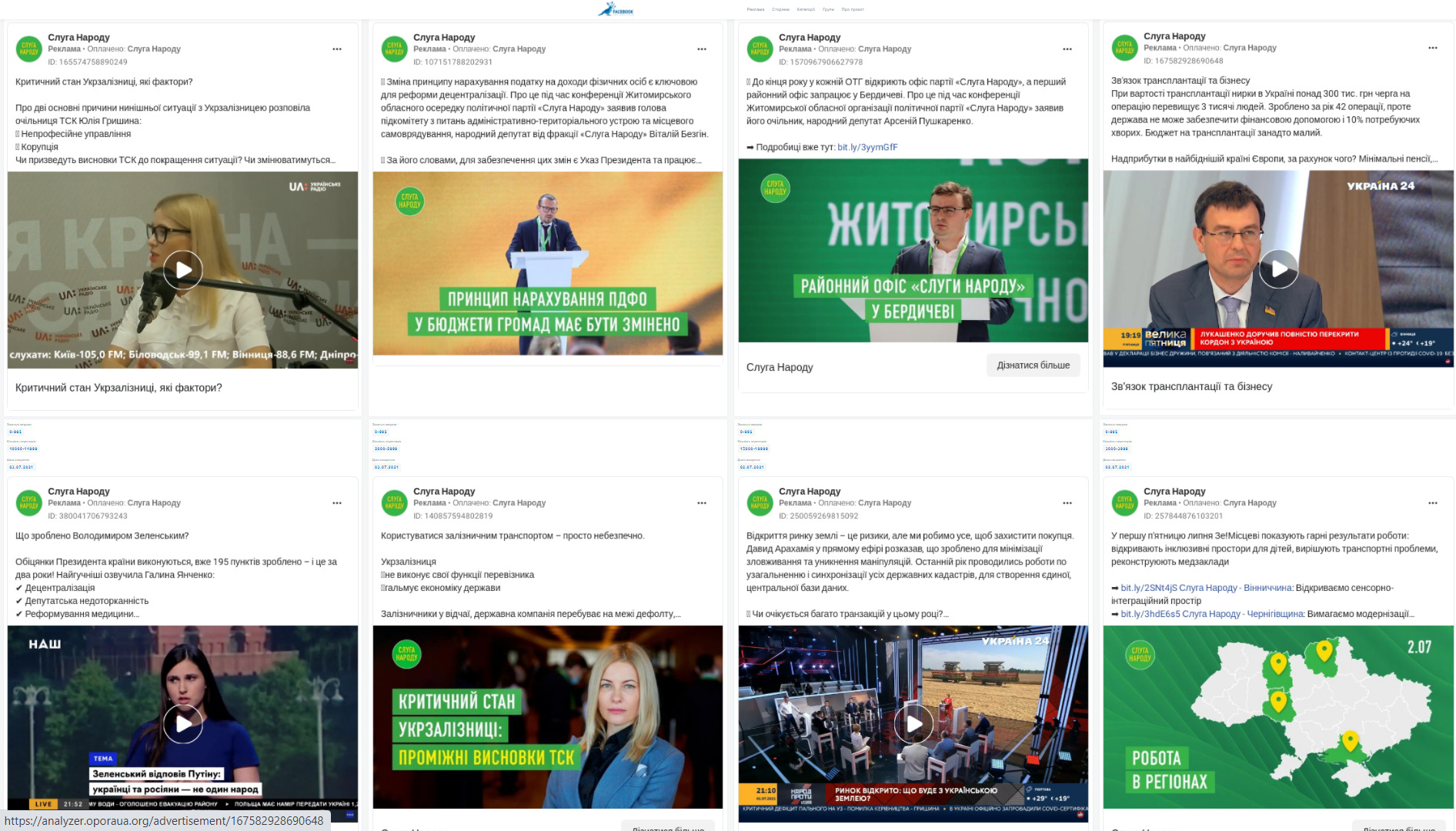 Майже 10 000 доларів було вкладено у політичну рекламу в Facebook зі сторінки політичної партії “Слуга Народу”. Лідирує сторінка і за кількістю рекламних оголошень, які транслювалися протягом місяця — всього 400 рекламних постів. Поширювався серед користувачів усіх регіонів України контент досить широкої тематики: пояснення позицій партійців щодо законодавчих ініціатив;  їхня оцінка зовнішньополітичних викликів; уривки телеефірів за участі представників партії; власні відеоблоги; декілька рубрик, присвячених місцевим командам; інформація про з’їзд партії; а також виступи “слуг народу” на Всеукраїнському форумі “Україна 30” та допис про нову загальнонаціональну програму Президента.