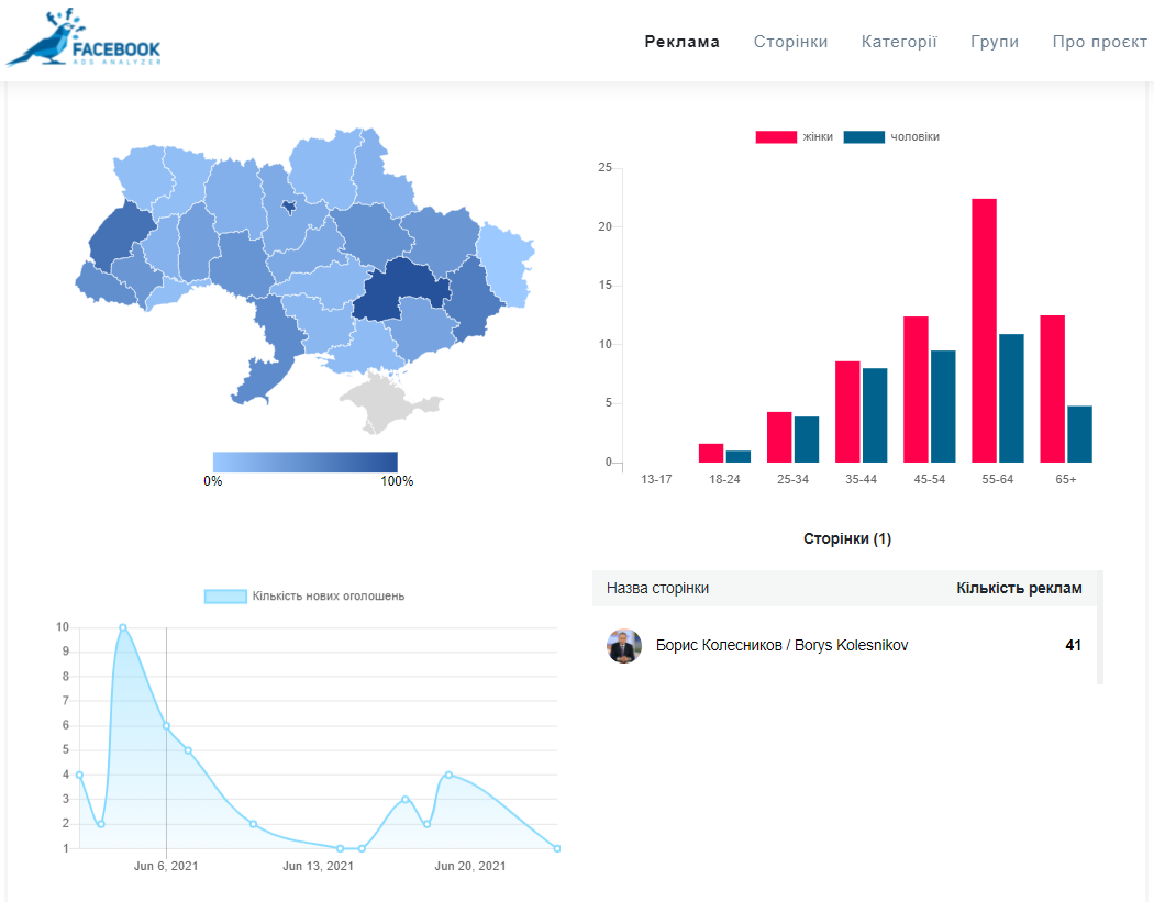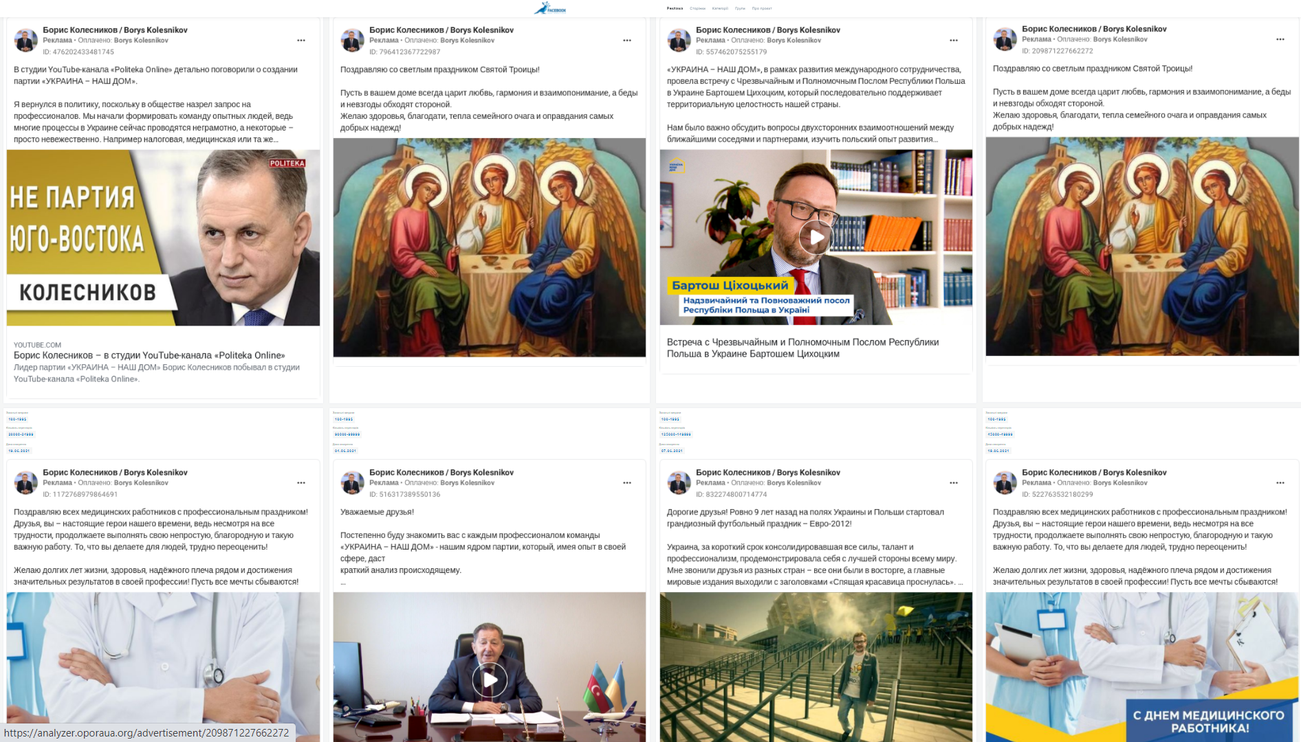 Вперше у десятці лідерів за витратами на політичну рекламу в Facebook опинилася сторінка колишнього Віцепрем'єр-міністра України та Міністра інфраструктури України в уряді Миколи Азарова (2010 — 2012 рр.) Бориса Колеснікова, яка витратила 4 104 американські долари на рекламу 47 оголошень. Більшість публікацій присвячена створенню партії “Україна — наш дім” (відповідно до даних Opendatabot, 29 червня 2021 року політична партія “Рідний край” отримала назву “Україна — наш дім”, змінила адресу реєстрації з міста Дружківка Донецької області на Київ, а новим її керівником став Борис Колесніков). Також на сторінці висвітлювалися позиції Бориса Колеснікова щодо низки політичних питань, наприклад, закону про деолігархізацію. Окрема група публікацій — вітання зі святами.