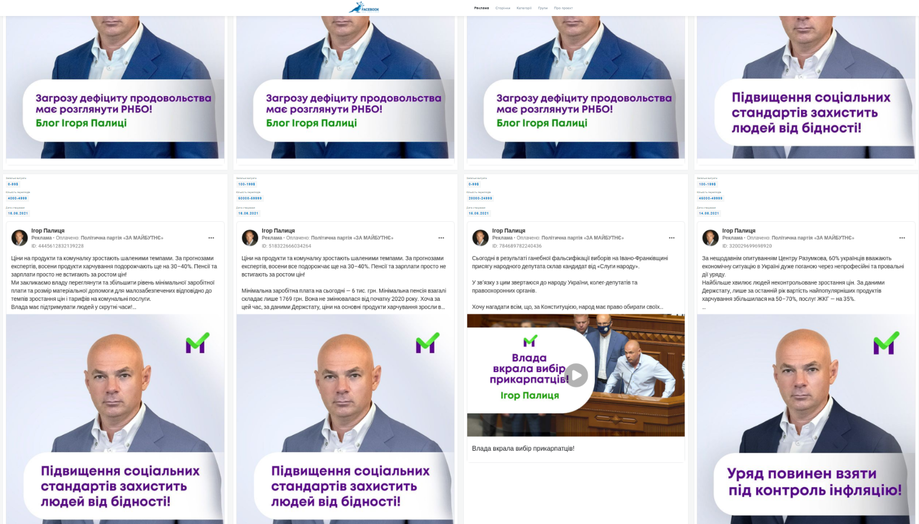 На особистій сторінці лідера політичної партії “За майбутнє” Ігоря Палиці було розміщено 46 рекламних постів, які за стилістикою та контентом схожі з рекламними публікаціями на офіційній сторінці партії. Інвестувала партія у рекламу на сторінці Палиці 3 856 доларів. За змістом дописи — це позиція народного депутата щодо різних політичних та економічних питань.