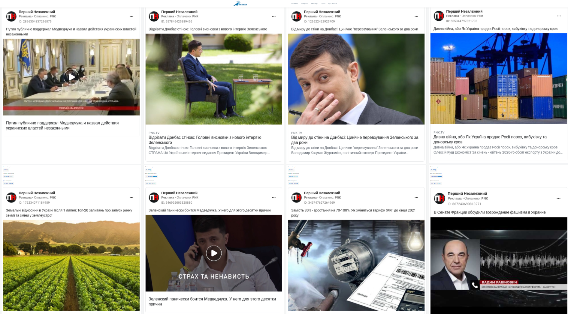 Якщо на перших двох сторінках кожне окреме рекламне оголошення коштувало близько 100 доларів, то на сторінці каналу Перший Незалежний вартість була більшою. Так, у червні на рекламу 28 публікацій на сторінці, яка з моменту свого створення (12 лютого 2021 року) постійно потрапляє до десятки найщедріших рекламодавців, було залучено 5 862 американські долари. У рекламних публікаціях на сторінці здебільшого критикується робота президента Зеленського; запровадження ринку землі в Україні; і водночас у позитивному тоні висвітлення  діяльності ОПЗЖ (наприклад, мітинг прихильників під Верховною Радою та хода партійців на шану загиблих у Другій світовій війні). Реклама каналу в соцмережі була орієнтована на покази Facebook-користувачам з усіх регіонів України.