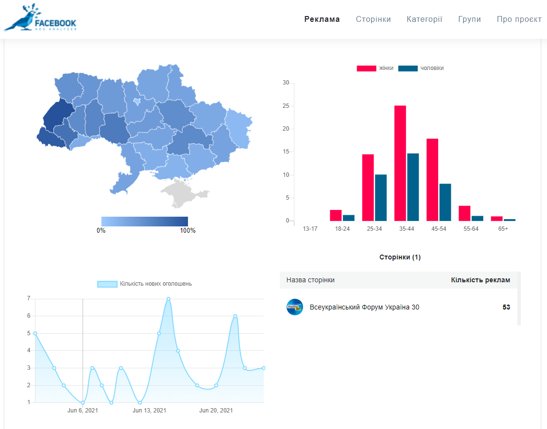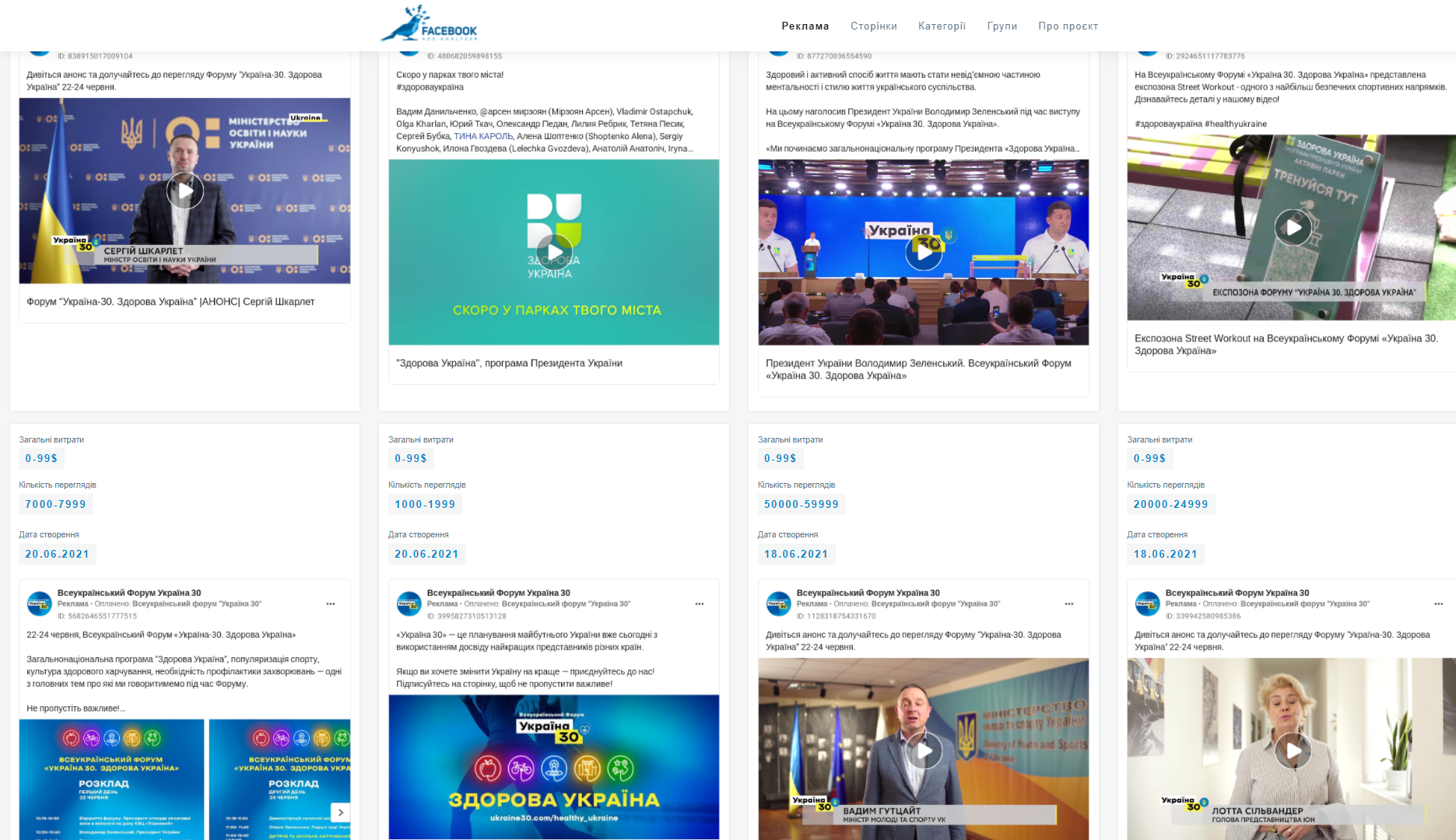 Тривала у червні промоція Всеукраїнського Форуму Україна 30, ініціатива створення якого належить Президенту України Володимиру Зеленському (відповідно до інформації в описі сторінки).  Також у дисклеймері зазначається, що рекламу оплачує КВЦ Парковий, там же за збігом обставин знаходиться офіс партії “Слуга народу”. Цього місяця на піар виступів учасників Форуму, якими були представники влади всіх рівнів, експертного середовища, громадянського суспільства та міжнародної спільноти, було витрачено 3 964 американські долари. Реклама зі сторінки налаштована на покази аудиторії в усіх областях України (найбільше — користувачам із Львівської та Закарпатської областей). А от у вікових групах рекламодавці зробили акцент на “молодшій аудиторії” — жінок віком 35 — 44 роки.