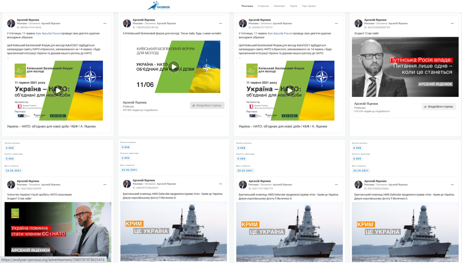 Дещо більшу суму, ніж у травні, використав для онлайн-просування на своїй сторінці  Арсеній Яценюк. На промоцію 201 публікації на сторінці політика було витрачено 4 446 доларів.  Значна частина рекламних оголошень на сторінці публікується по кілька разів з налаштуванням показів для різних регіонів України. Всі оплачені дописи можна розділити на кілька умовних груп: присвячені зовнішній політиці (НАТО, Російська Федерація, Крим, зв’язок Путін-Медведчук); інформування про Молодіжний Київський безпековий форум; вітання до свят; реклама Telegram-каналу. Традиційно використовуються меседжі із закликом до взаємодії: “Згоден? Тисни лайк!”. Контент зі своєї сторінки політик пропонує користувачам з усіх регіонів, однак перевага віддається мешканцям Львівської та Івано-Франківської областей.