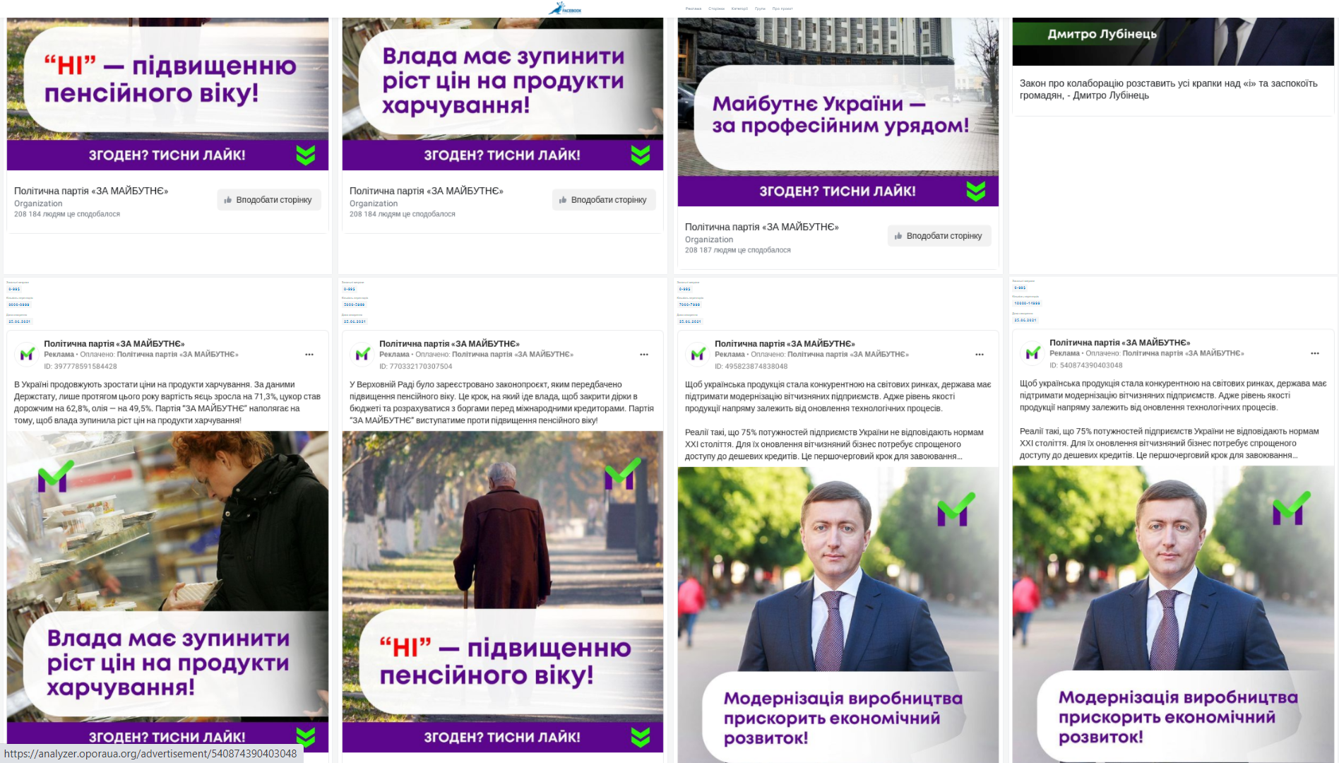 Значно перевищують витрати з інших сторінок вкладення в політичну рекламу на офіційній сторінці партії “За майбутнє” — 8 735 доларів. У червні з центральної сторінки партії транслювалося 107 рекламних публікацій. Контент сторінки присвячений висвітленню позиції партійців щодо політичних питань та законодавчих ініціатив. Попри яскраві кольори у візуальному оформленні дописів, більша частина з них містила негативну оцінку сьогодення та нагнітаючі меседжі про бідність, продовольчий дефіцит, зростання цін, борги, податковий тиск, інфляцію. Водночас на сторінці висвітлювався партійний з'їзд, йшлося про підтримку та інвестиції в регіони, а також публікувалися вітальні пости до низки червневих свят.   Таргетувалася реклама на користувачів з усіх регіонів країни, досить високий був відсоток показів для користувачів з Донецької області (7,1%).