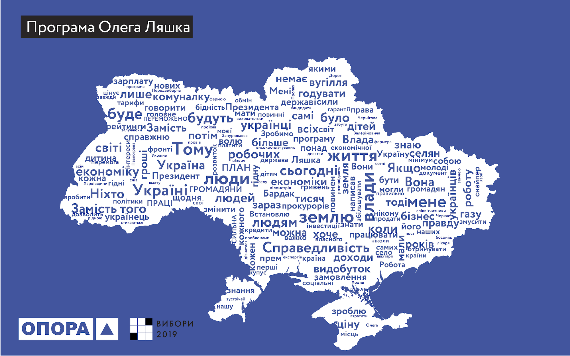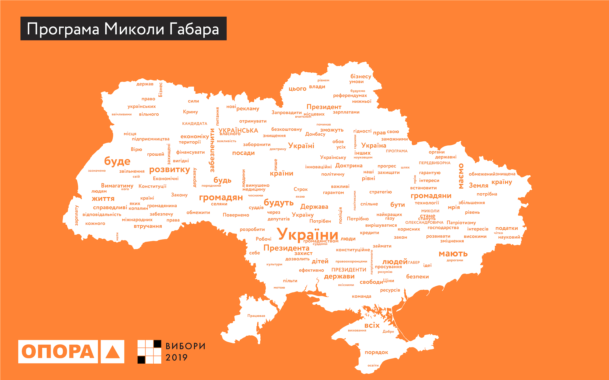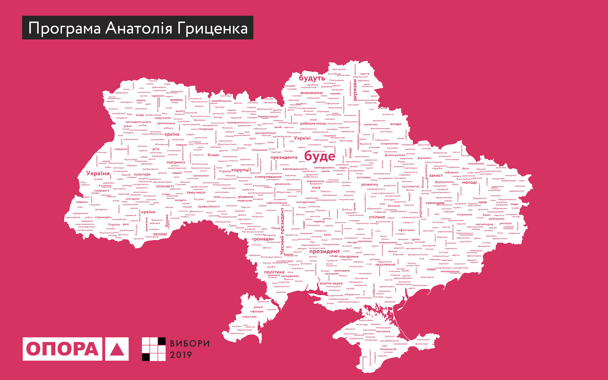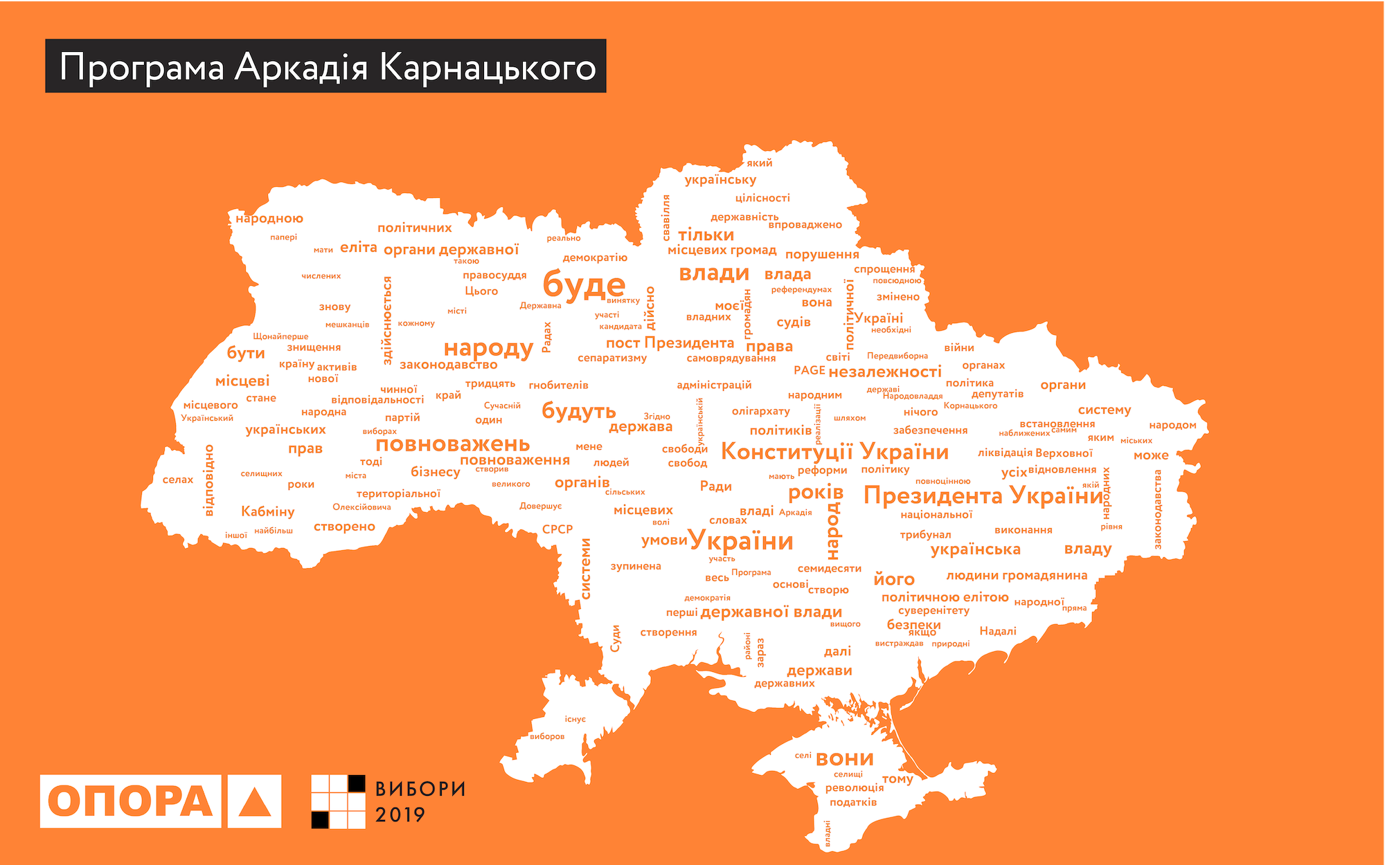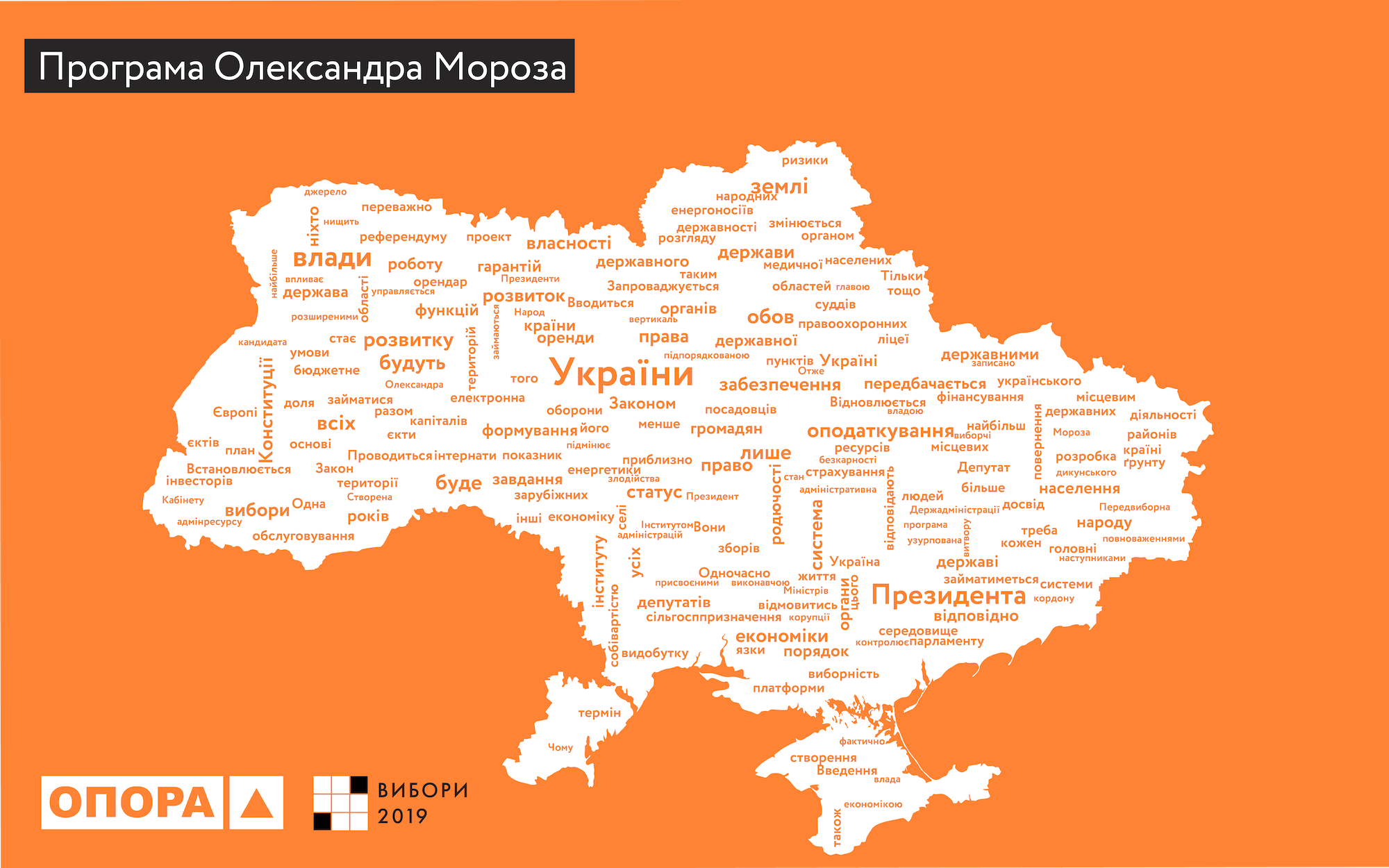 Ми довго думали над тим, як проаналізувати програми кандидатів у Президенти, і вирішили залишити це на розсуд виборців. Тому наш комп'ютер просто намалював мапи України з найбільш вживаними словами в програмах. Дивіться, реагуйте.