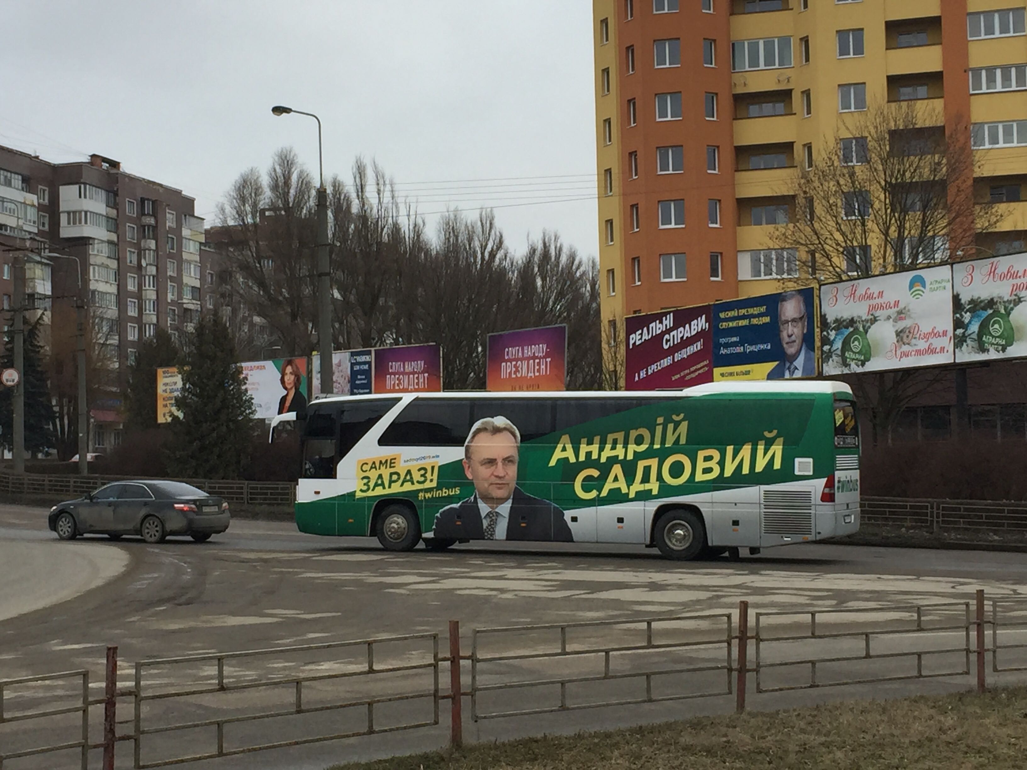 15 лютого у Тернополі спостерігачі ОПОРИ зафіксували брендований автобус кандидата Андрія Садового.