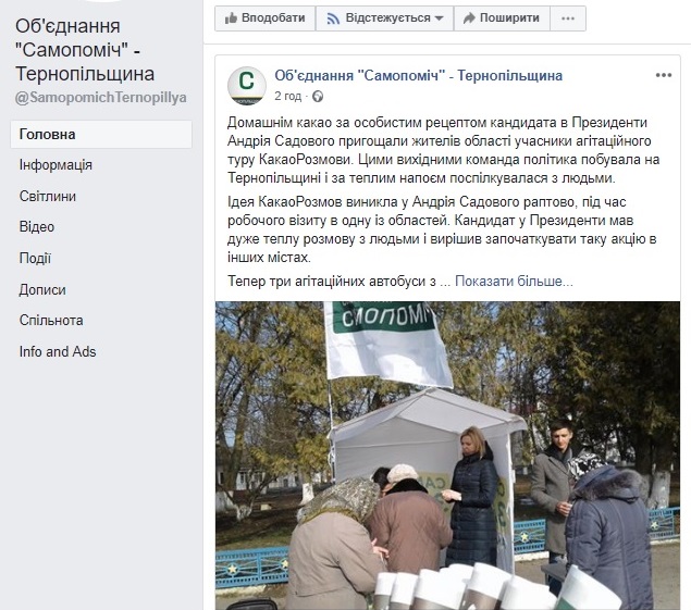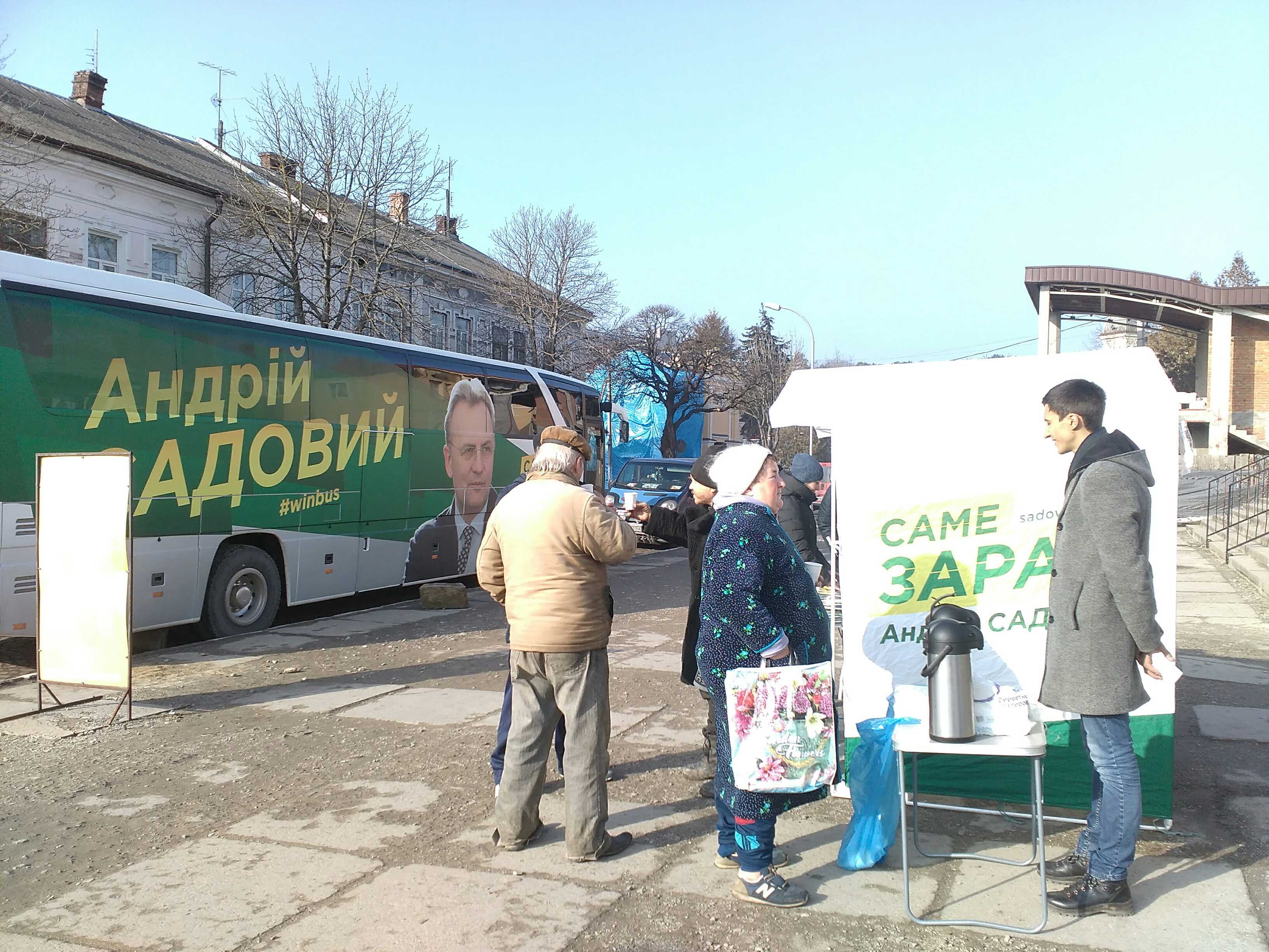 Наступного дня, 16 лютого, представники команди Садового проводили агітацію у районному центрі Теребовля. Вони розмовляли з перехожими, роздавали друковані агітаційні матеріали, а також при цьому пригощали какао. Напій завбачливо зберігався у термосі.