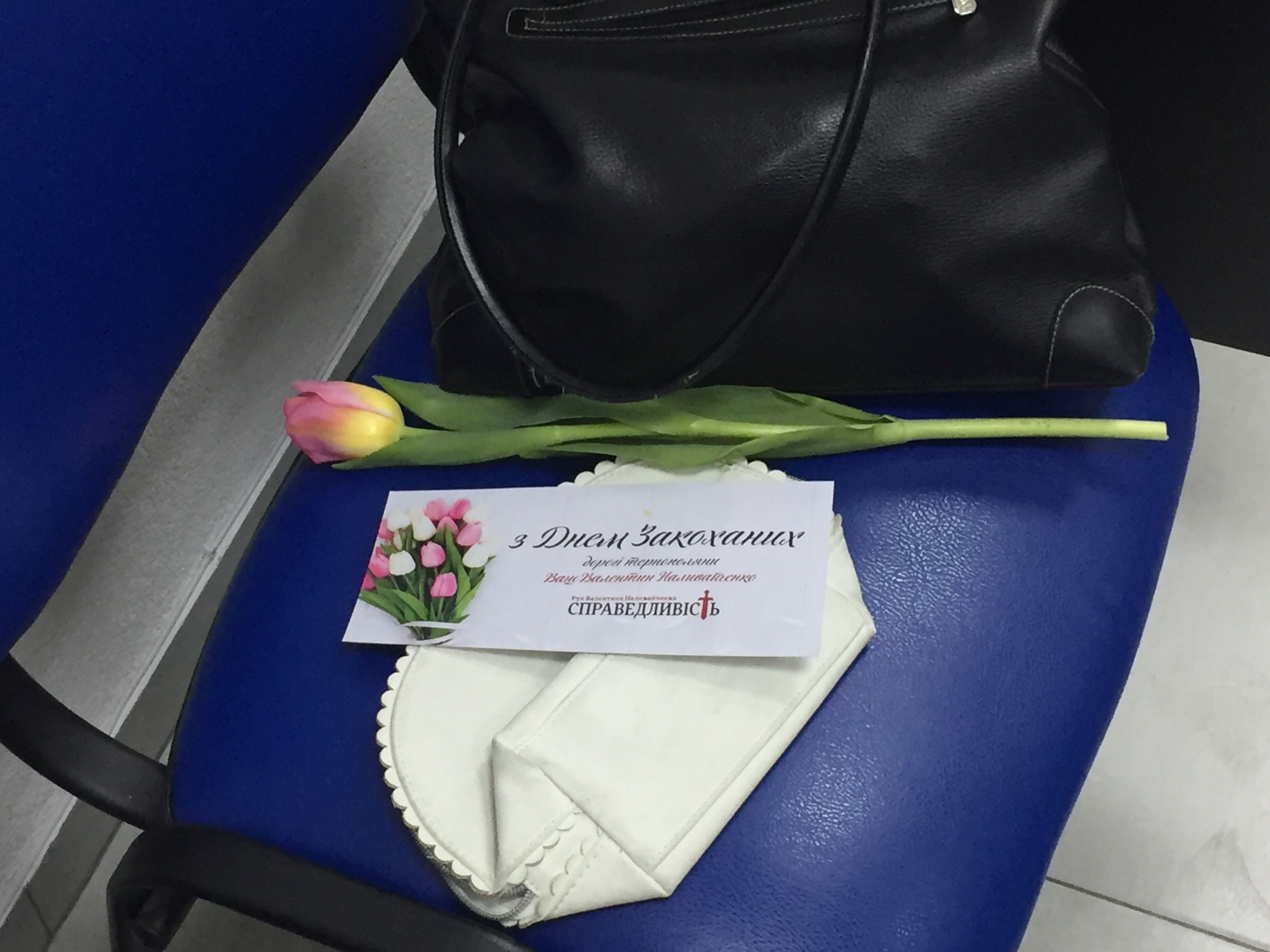На початку зустрічі для присутніх стали несподіванкою подарунки для жінок у вигляді валентинок та тюльпанів. Ці вітальні листівки з написом «З Днем Закоханих Дорогі тернополяни Ваш Валентин Наливайченко» та символікою партії «Рух Валентина Наливайченка «Справедливість» не мали вихідних даних.