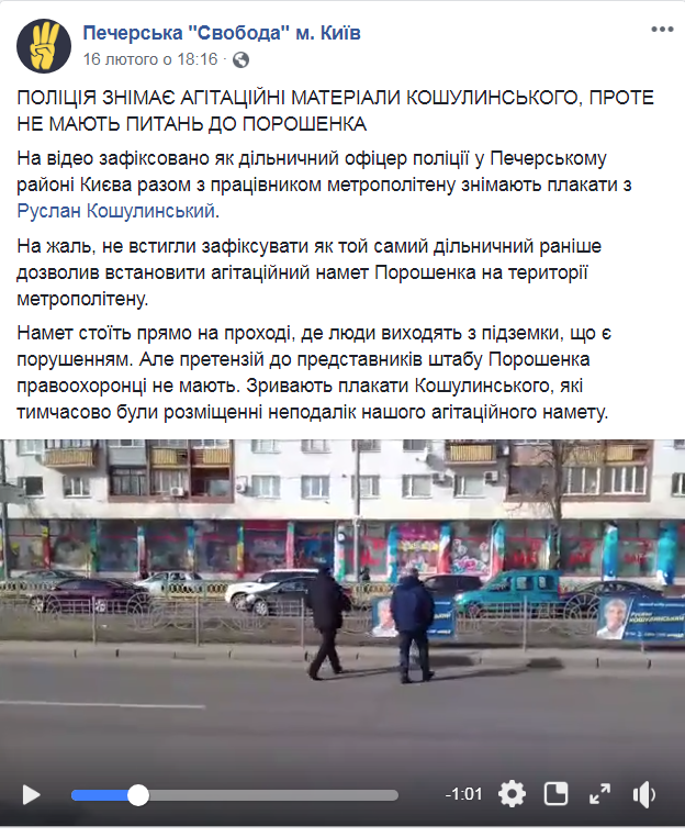 Водночас 16 лютого на Facebook-сторінці Печерської районної організації ВО «Свобода»  з’явилось відео і повідомлення про те, як дільничний офіцер поліції зняв агітаційний плакат Кошулинського в Печерському районі.