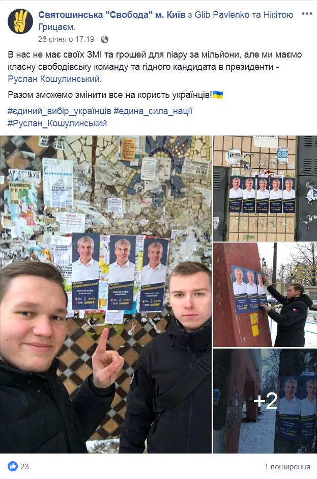 Крім того, 26 січня на Facebook-сторінці Святошинської районної організації ВО «Свобода»  з’явися фотозвіт про те, як активісти партії розклеюють аналогічні плакати в Святошинському районі столиці. «В нас немає своїх ЗМІ та грошей для піару за мільйони, але ми маємо класну «свободівську» команду та гідного кандидата в президенти – Руслана Кошулинського», – йдеться, зокрема, у повідомленні.
