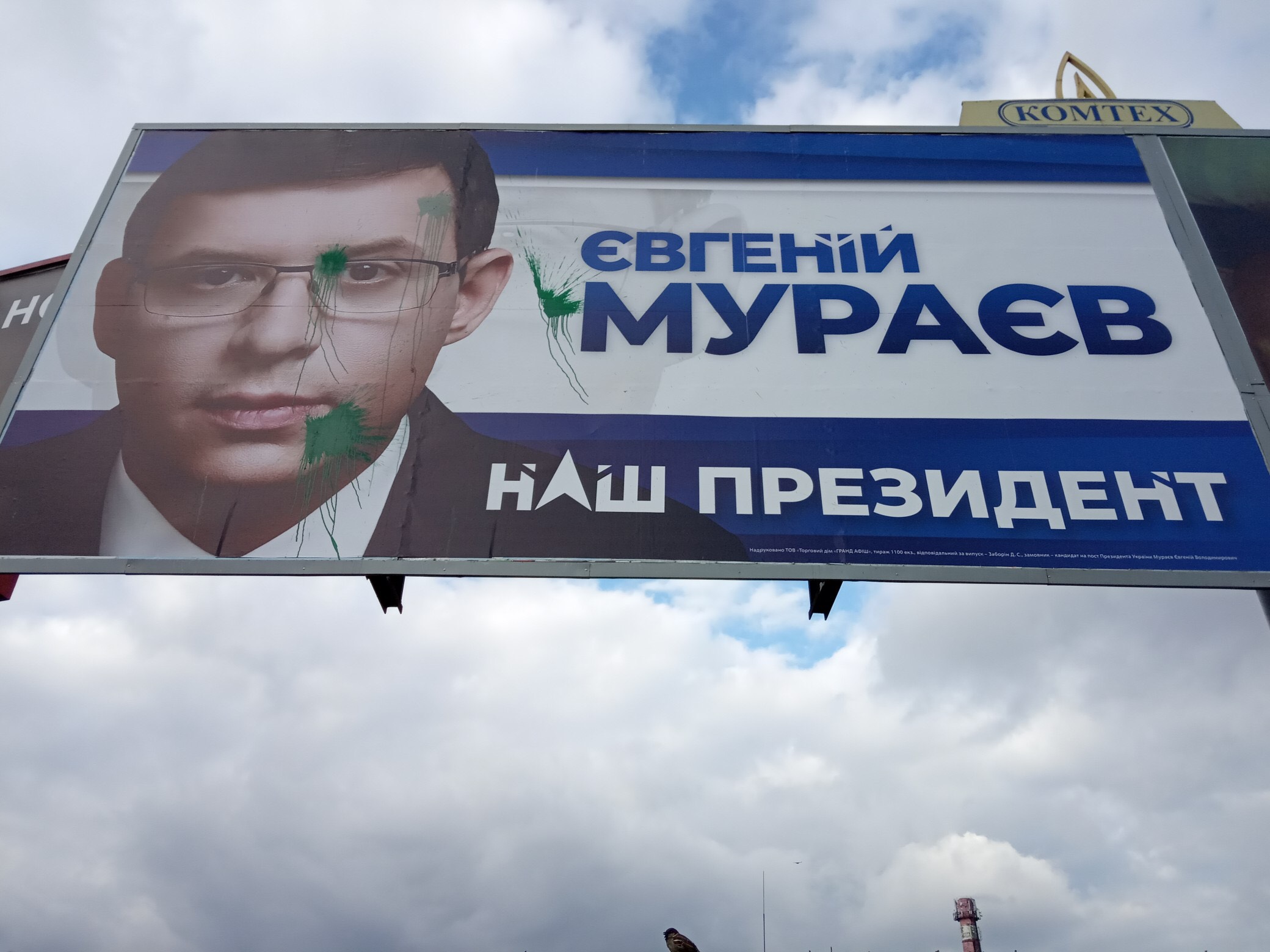 Білборд із зображенням Євгенія Мураєва та надписом «Євгеній Мураєв наш президент» невідомі заляпали зеленою фарбою. Зіпсований агітматеріал знаходиться у Луцьку, на вулиці Конякіна. Зауважимо, що оскільки Євгеній Мураєв є кандидатом у Президенти України, подібні дії можуть бути кваліфіковані відповідно до частини 2 статті 157 Кримінального кодексу України як перешкоджання діяльності суб'єкта виборчого процесу, поєднані із пошкодженням майна.