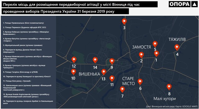 Мапа місць для розміщення передвиборної агітації у Вінниці