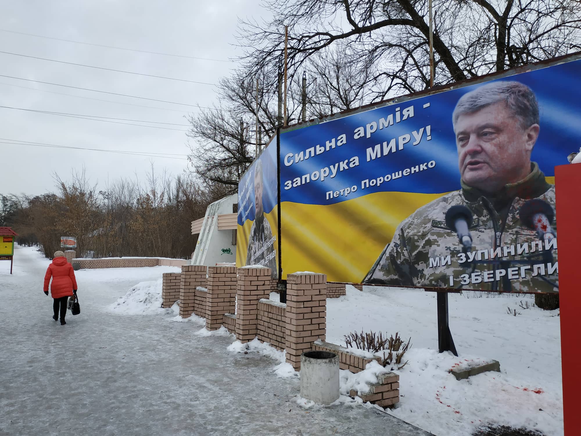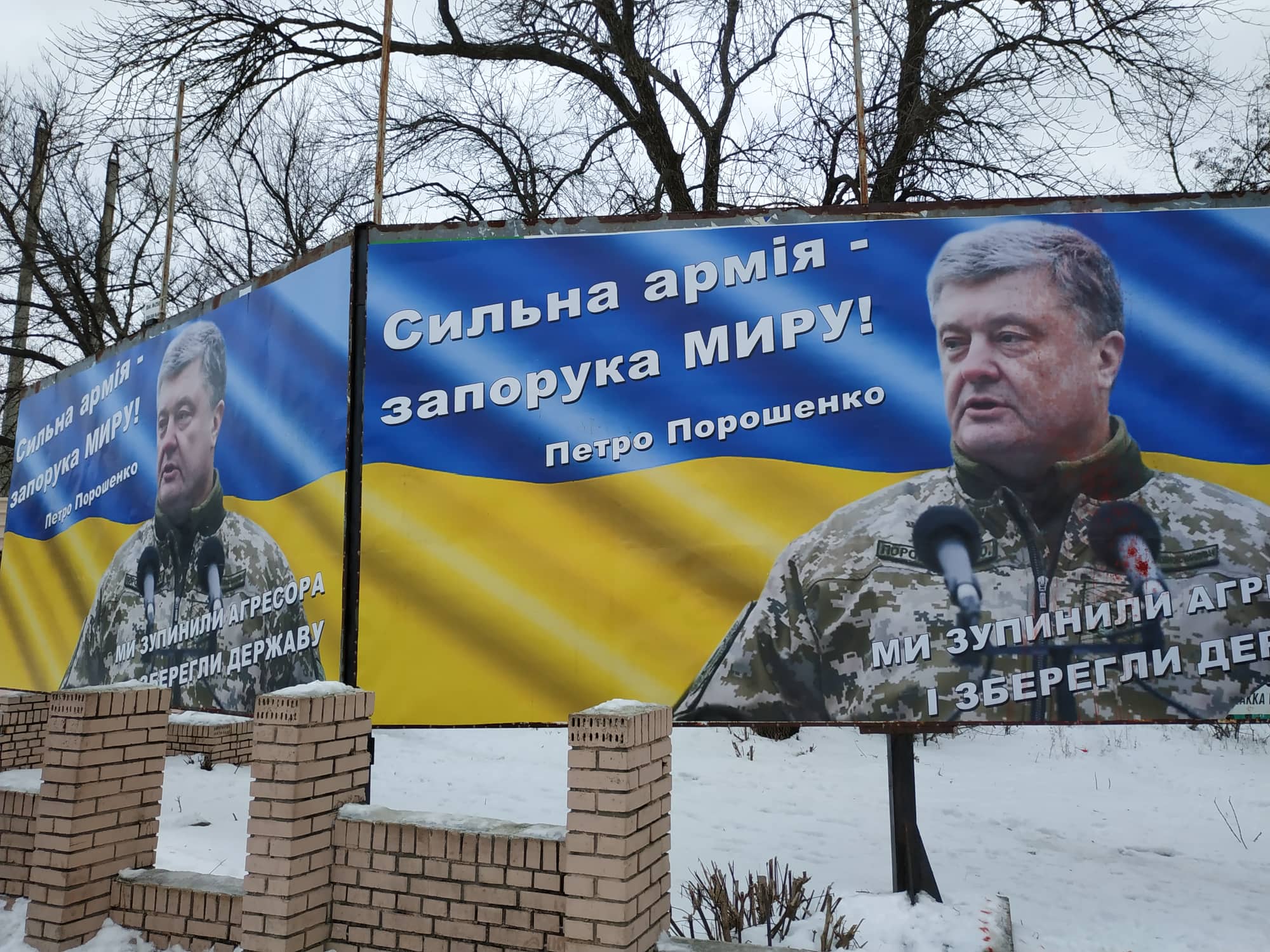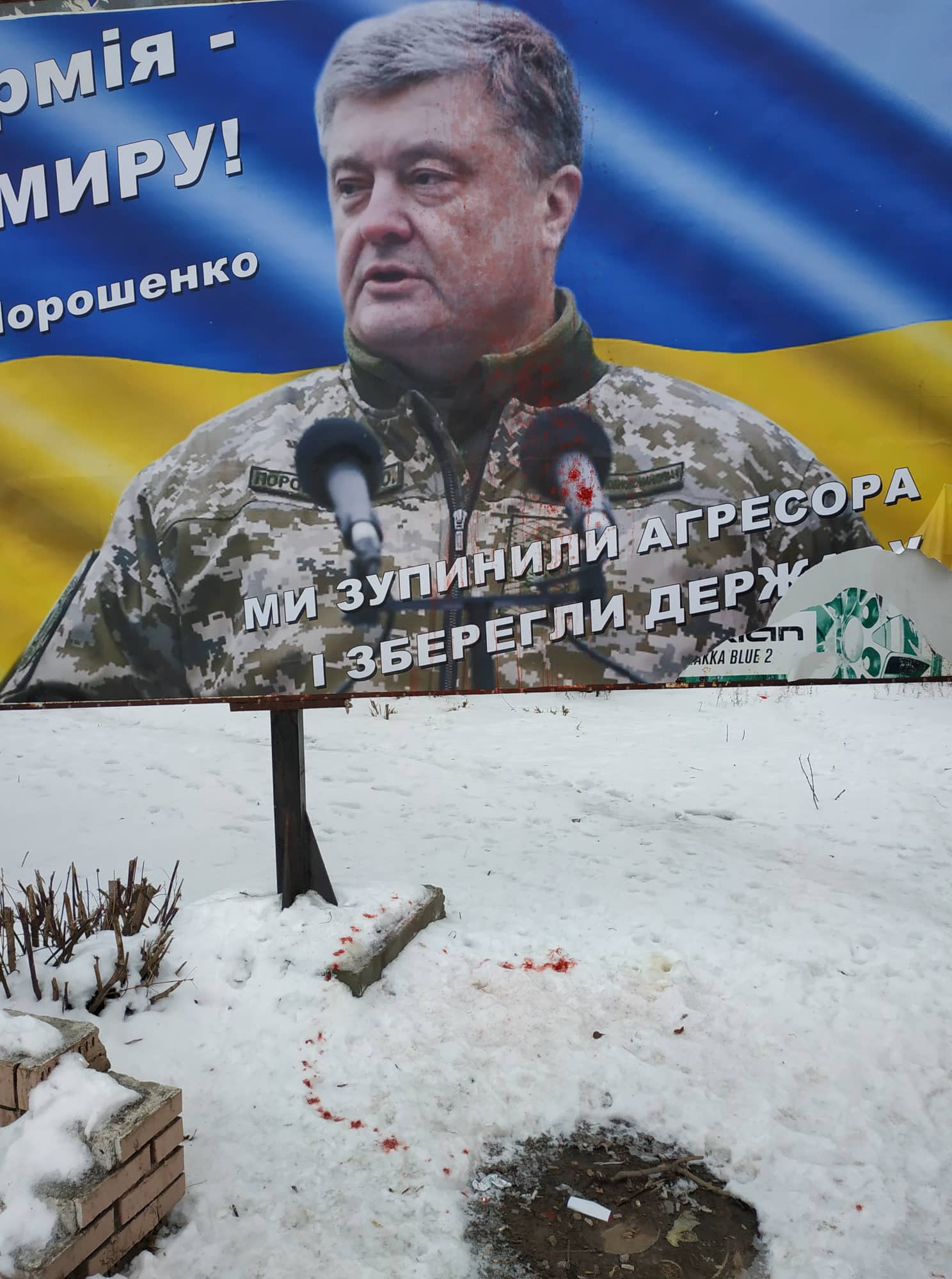 В районі торгівельного центру «Амстор» на перетині вул. Маяковського та Олекси Тихого, спостерігачі ОПОРИ зафіксували білборд, із зображенням Петра Порошенка, який був облитий речовиною червоного кольору. Сліди невідомої речовини помітні і на снігу, неподалік від білборду.
