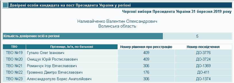 Відповідно до постанови ЦВК від 13 лютого 2019 року № 206, кандидат Валентин Наливайченко визначив довірених осіб у ще двох волинських округах. Так, інтереси кандидата у межах округу № 21 представлятиме Ігор Романчук, а в окрузі № 23 – Борис Александропуло. Ігор Романчук є керівником товариства із обмеженою відповідальністю «Народний дім», яка зареєстрована у місті Рівне. Борис Александропуло зареєстрований як фізична особа-підприємець. Також зауважимо, що особа з таким же іменем і прізвищем є керівником громадської організації «Інвалідів Рівненщини «Позиція». Відповідно до постанови № 409 від 28 лютого, представниками в округах № 19 та № 20 стали Олег Гупало та Юрій Онищук відповідно. Осіби з такими іменами та прізвищами донедавна працювали інженерами відділу економічної безпеки ПрАТ «Волиньобленерго».