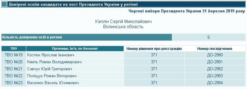 Відповідно до постанови № 371 від 22 лютого 2019 року, інтереси Сергія Капліна в окрузі № 19 представлятиме Ярослав Костюк, в окрузі № 20 – Роман Кметь, в окрузі №21 – Юрій Савчук, в окрузі № 22 – Роман Поліщук, в окрузі № 23 – Василь Василюк. Ярослав Костюк є директором ТзОВ «Аграрно-виробничо-торгова фірма «Старк», а Роман Кметь очолював та був засновником ТзОВ «КРИСТАЛ – АГРО», яка перебуває у стані припинення. Повний тезка Юрія Савчука був керівником управління водопровідно-каналізаційного господарства міста Ковеля, а нині перебуває на пенсії. Роман Поліщук працює у комунальному закладі «Луцька гімназія № 18 Луцької міської ради», а повний тезка Василя Василюка на місцевих виборах 25 жовтня 2015 року балотувався до Камінь-Каширської міської ради від партії «Партіот».