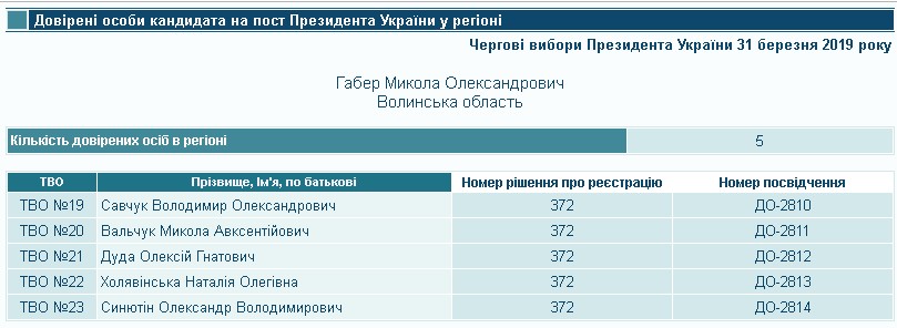 Кандидат Микола Габер теж зареєстрував п’ятьох довірених осіб на Волині. В окрузі № 19 нею став Володимир Савчук, в окрузі № 20 – Микола Вальчук, в окрузі № 21 – Олексій Дуда, в окрузі № 22 – Наталія Холявінська, в окрузі № 23 – Олександр Синютін. Повний тезка Володимира Савчука був головою Володимир-Волинської РДА, Микола Вальчук – пенсіонер, повний тезка якого у 2015 році був кандидатом на посаду у Ковельську прокуратуру. Олександр Синютін працює вчителем музичного мистецтва НВК «Маневицька ЗОШ № 2 – гімназії». Даних про Наталію Холявінську, окрім того, що жінка мешкає у Ківерцях, знайти не вдалося.