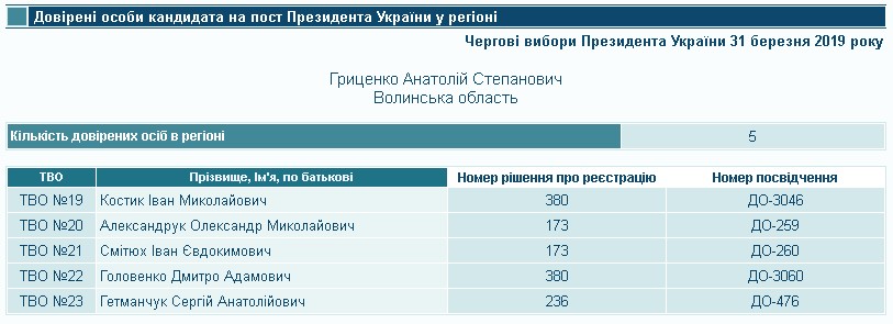 Відповідно до постанови № 380 від 25 лютого зі ще двома довіреними особами в межах волинських округів визначився й кандидат Анатолій Гриценко. Так, його інтереси в окрузі №19 представлятиме Іван Костик, а у 22 – Дмитро Головенко. Іван Костик – пенсіонер, засновник організації роботодавців міста Нововолинськ, а Дмитро Головенко – керівник ОСББ Ветеранів, 22 у місті Луцьку.