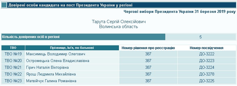 Також п’ятьох довірених осіб у волинських округах зареєстрував Сергій Тарута. Довіреною особою в окрузі № 19 став Володимир Максимець, в окрузі № 20 – Олена Остромецька, в окрузі № 21 – Наталія Гірич, в окрузі № 22 – Людмила Ярош, в окрузі № 23 – Галина Матвійчук. Людмила Ярош є працівницею Луцької міської дитячої поліклініки. Повна тезка Наталії Гірич зазначена як помічник-консультант депутата Ковельської міськради від ВО «Батьківщина» Геннадія Кіндера, а також як голова громадської приймальні партії у Ковелі. Даних про Володимира Максимця, Олену Остромецьку та Галину Матвійчук, які дозволили б пов’язати їх з Волинню чи кандидатом, знайти не вдалося. Відомо лише, що вказані довірені особи тимчасово безробітні.