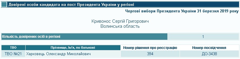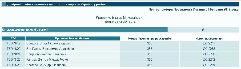 Відповідно до постанови ЦВК № 356 від 21 лютого 2019 року, кандидат Віктор Кривенко зареєстрував п’ять довірених осіб у межах волинських округів. Відтак, інтереси кандидата в окрузі №1 9 представлятиме Віталій Бродоса, в окрузі № 20 – Володимир Бут-Гусаїм, в окрузі № 21 – Андрій Богданчук, в окрузі № 22 – Дмитро Климук, а в окрузі №23 – Андрій Нестеренко. Віталій Бродоса є засновником та керівником товариства з обмеженою відповідальністю «Вітаб», основний вид діяльності якого – оптова торгівля зерном, необробленим тютюном, насінням і кормами для тварин. Володимир Бут-Гусаїм відомий на Волині громадський активіст, також він є засновником та керівником ГО «Сучасна Волинь». Андрій Богданчук очолює Турійську районну організацію «Народного Руху України», Дмитро Климук – керівник громадської організації «Центр юридичної допомоги», а особа з іменем і прізвищем Андрій Нестеренко є працівником товариства із обмеженою відповідальністю «Луцький хлібокомбінат».