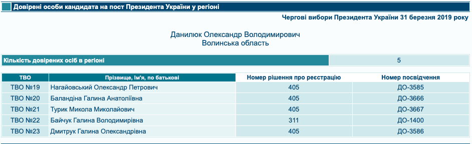 Кандидат Олександр Данилюк відповідно до постанови ЦВК від 15 лютого 2019 року № 311 зареєстрував свою першу і наразі єдину довірену особу у межах Волині. Відтак, кандидат має представницю в крузі № 22 – Галину Байчук. Жінка з таким іменем та прізвищем зареєстрована як фізична особа-підприємець, яка займається оптовою торгівлею. Відповідно до постанови № 405 від 28 лютого кандидат зареєстрував ще чотирьох довірених осіб. В окрузі № 19 його інтереси представлятиме Олександр Нагайовський, в окрузі № 20 – Галина Баландіна, в окрузі № 21 – Микола Турик, в окрузі № 23 – Галина Дмитрук. Повний тезка Олександра Нагайовського – волонтер, який займався збором допомоги для волинської 14 ОМБР, про решту трьох представників не вдалося знайти інформації, яка б дозволила асоціювати їх з Волинню.