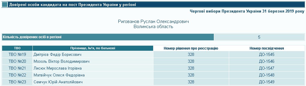 Згідно із постановою ЦВК № 328 від 16 лютого 2019 року кандидат Руслан Ригованов зареєстрував довірених осіб у всіх волинських округах. Так, в окрузі № 19 представляти свої інтереси він довірив Федору Дмітрієву, в окрузі № 20 - Віктору Мозолю, в окрузі №21 – Мирославі Лисюк, окрузі № 22 – Олесі Матвійчук, а в окрузі № 23 – Юрію Семчуку. Федір Дмітрієв є пенсіонером, під час місцевих виборів 2017 року особа з іменем та прізвищем балотувалася до Зарічненської ОТГ шляхом самовисування та був обраний депутатом. Повний тезка Віктора Мозоля певний час був директором магазину «Нова лінія» у Луцьку. Повна тезка Олесі Матвійчук є діловодом Волинській обласній організації Радикальної партії Олега Ляшка на Волині, а повний тезка Юрія Семчука на сайті волинського осередку партії вказаний як «координатор округів». Жодних даних, які б дозволили асоціювати Мирославу Лисюк з Волинською областю, знайти не вдалося.