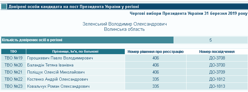 Володимир Зеленський у межах волинських округів найперше визначився із довіреними особами в округах № 22 та № 23. Так, в 22-ому окрузі його представником став Андрій Костенко, а в 23-ому – Роман Ковальчук. Андрій Костенко є співвласником громадської організації «Волинський актив молоді», директором якої, у свою чергу, є представник «Зе!команди» у Волинській області Валерій Стернійук. Роман Ковальчук очолює ГО «Спортивний клуб козацьких бойових мистецтв «Герць», зареєстровану у Луцьку. Відповідно до постанови № 406 від 28 лютого, кандидат визначився і з представниками в інших округах. В окрузі № 19 його представлятиме Павло Горошкевич, в окрузі № 20 – Тетяна Баландін, в окрузі № 21 - Олексій Поліщук. Тетяна Баландін є співзасновницею ГО «Центр жіночих ініціатив «Марія», яка зареєстрована у місті Горохів. Даних про Павла Горошкевича, окрім того, що він мешкає у Володимирі-Волинському, знайти не вдалося, як і інформації, яка б дозволила асоціювати із Волинню Олексія Поліщука.