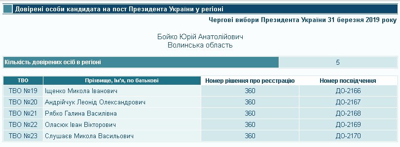 Кандидат Юрій Бойко також зареєстрував довірених осіб у кожному із волинських округів. Так, згідно із постановою № 360 від 21 лютого 2019 року, його довіреною особою в окрузі № 19 став Микола Іщенко, в окрузі № 20 – Леонід Андрійчук, в окрузі № 21 - Галина Рябко, в окрузі № 22 – Іван Оласюк, в окрузі № 23 – Микола Слушаєв. Микола Іщенко є працівником ПрАТ «УСК «Княжа», повний тезка Леоніда Андрійчука раніше займав пост голови Горохівської РДА, а повна тезка Галини Рябко була головою Ковельської районної організації «Партії Регіонів». Повний тезка Миколи Слушаєва балотувався до Ківерцівської районної ради на чергових місцевих виборах 25 жовтня 2015 року від «УКРОПУ».