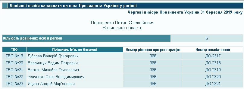 Відповідно до постанови ЦВК від 22 лютого № 366 із довіреними особами в усіх волинських округах визначився і Петро Порошенко. Так, в окрузі № 19 його інтереси представлятиме Валерій Діброва, в окрузі 20 – Вадим Ваврищук, в окрузі 21 – Михайло Бегаль, в окрузі 22 – Олег Усаченко, в окрузі 23 – Андрій Яцина. Валерій Діброва є відомим аграрієм, директором ТОВ «П’ятидні» та депутатом Волинської обласної ради від БПП «Солідарність». Вадим Ваврищук – учасник АТО, «кіборг», керівник ГО «Волинська спілка ветеранів антитерористичної операції». Михайло Бегаль займає посаду головного лікаря Ратнівської районної центральної лікарні та є депутатом Волиньради від БПП «Солідарність». Олег Усаченко – луцький адвокат, а Андрій Яцина – директор держпідприємства «Поліське лісове господарство».