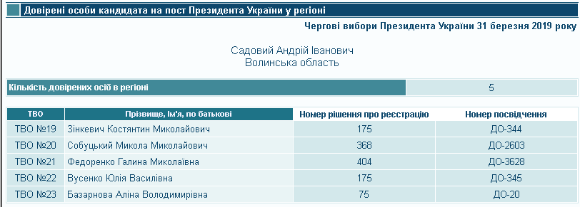Кандидат Андрій Садовий зареєстрував ще одну довірену особу на Волині. Відповідно до постанови № 368 від 22 лютого 2019 року ним став Микола Собуцький, відомий як волонтер та депутат Луцької міської ради від «Об’єднання «Самопоміч». Згідно із постановою № 404 від 28 лютого, інтереси кандидата в окрузі №21 представлятиме Галина Федоренко, відома як головна редакторка та керівник газети «Волинські губернські відомості». Також у 2015 році вона балотувалася до Луцької міської ради від «Самопомочі» по округу № 19.