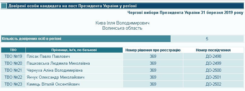 Згідно із постановою № 369 від 22 лютого 2019 року, кандидат Ілля Кива зареєстрував на Волині п’ятьох довірених осіб. Інтереси кандидата в окрузі № 19 представлятиме Павло Плісак, в окрузі № 20 – Людмила Пашковська, в окрузі № 21 – Аліна Чернуха, в окрузі № 22 – Олександр Янчук, в окрузі № 23 – Віталій Камець. Повний тезка Павла Плісака є засновником компанії «Пасме-Пластік», основним видом діяльності якого є виробництво будівельних виробів із пластмас. Людмила Пашковська зазначена як керівник Камінь-Каширської районної організації Соціалістичної партії України. Аліна Чернуха є керівником ратнівської районної організації партії та працює лікарем у Ратнівській ЦРЛ. Особа з прізвищем та іменем Олександр Янчук є працівником у фізичної особи-підприємця, а Віталій Камець очолює ТзОВ «СКВ Волинь-Сервіс», основним видом діяльності якого є ремонт і технічне обслуговування машин і устаткування промислового призначення.