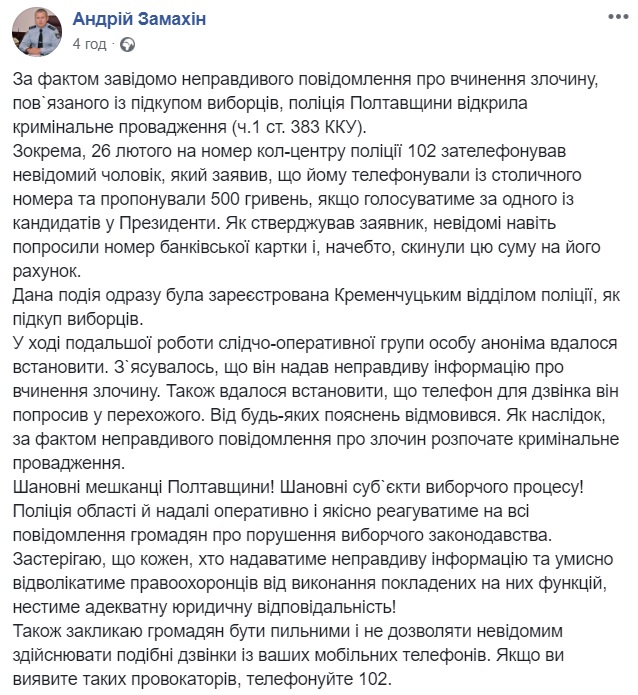 28 лютого Нацполіція в Полтавській області відкрила кримінальне провадження відносно завідомо неправдивого повідомлення про вчинення злочину – чоловік повідомив, що отримав 500 гривень за те, що проголосує на виборах за певного кандидата.