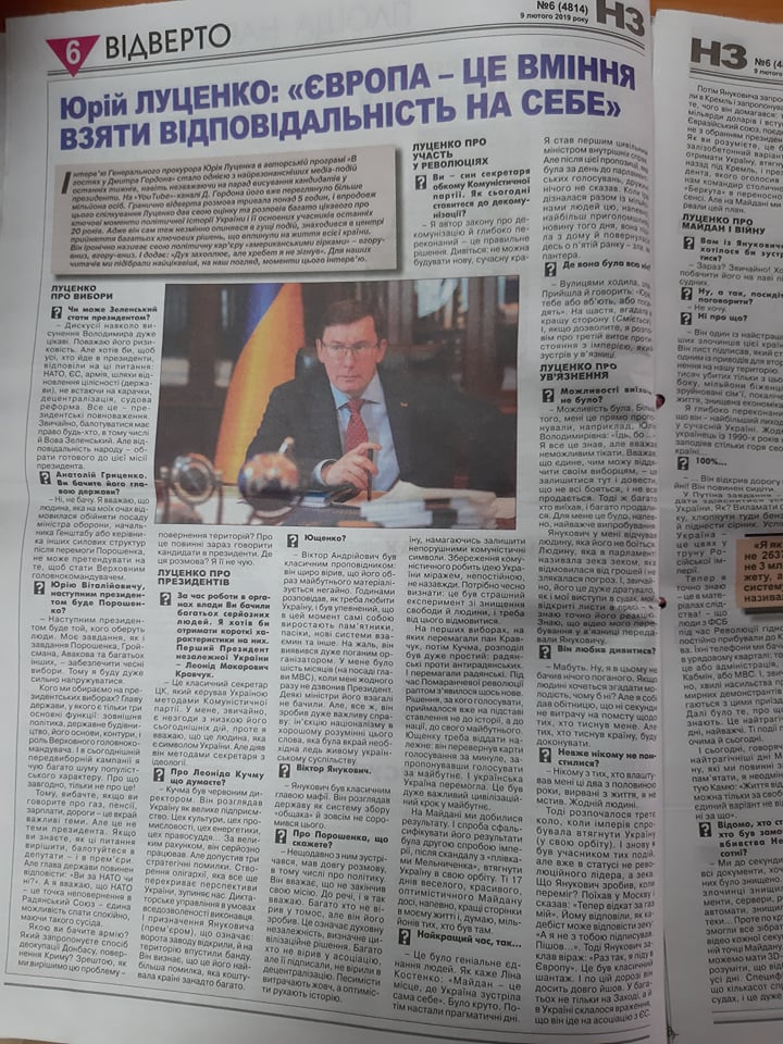 Однак варто звернути увагу, що у газеті «Новини Закарпаття» розмістили інтерв’ю із генеральним прокурором України Юрієм Луценком, де його запитують як він ставиться до декотрих кандидатів у Президенти, наприклад, чи бачить кандидата Анатолія Гриценка на пост глави держави. Стаття є передруком інтерв’ю, яке Юрій Луценко дав в ефірі програми «В гостях у Дмитра Гордона». Відео та частини тексту цього інтерв’ю розміщені в різних інтернет-виданнях, наприклад - «Українська правда», «Гордон», «Insider news», «TheБабель» та інших. Текст публікації є і у електронній версії газети «Новини Закарпаття».
