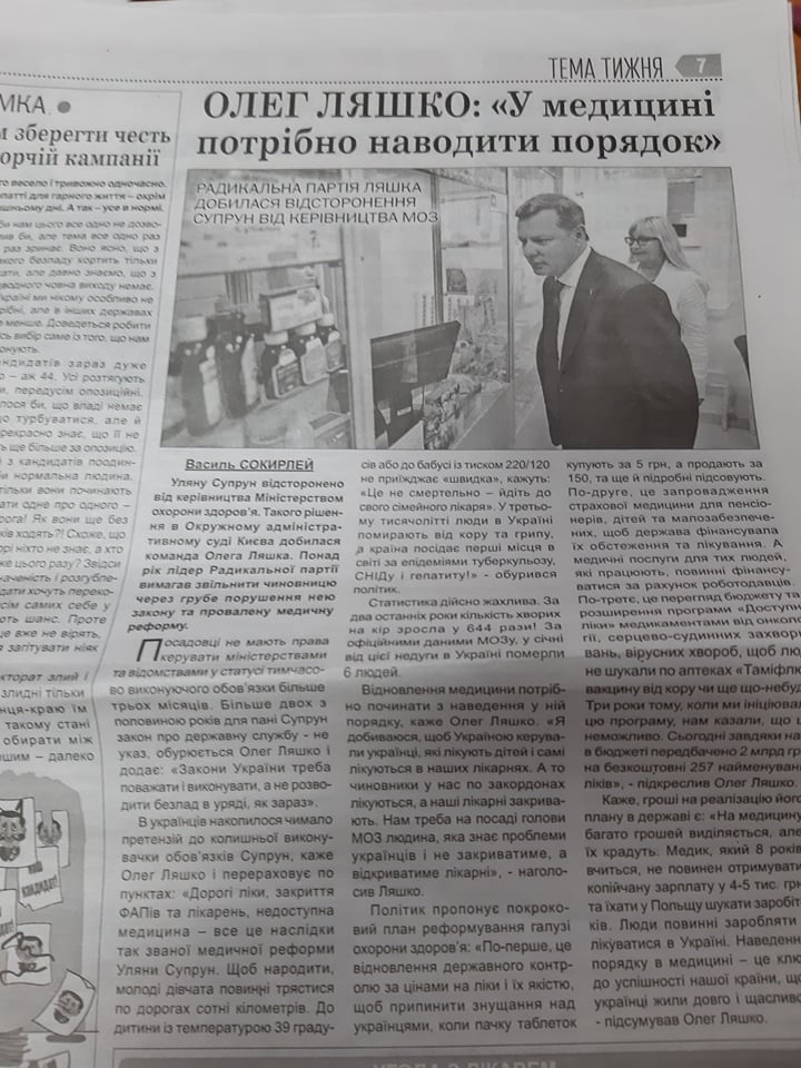 У газеті «Неділя» від 15-21 лютого також є матеріал зі згадками Олега Ляшка із заголовком «Олег Ляшко: у медицині потрібно наводити порядок». У цьому тексті йдеться також про відсторонення Уляни Супрун із посади та про план Ляшка для реформування галузі охорони здоров’я. Загалом, можна зробити висновок, що ці матеріали у двох газетах однакові, різниться лише заголовок.
