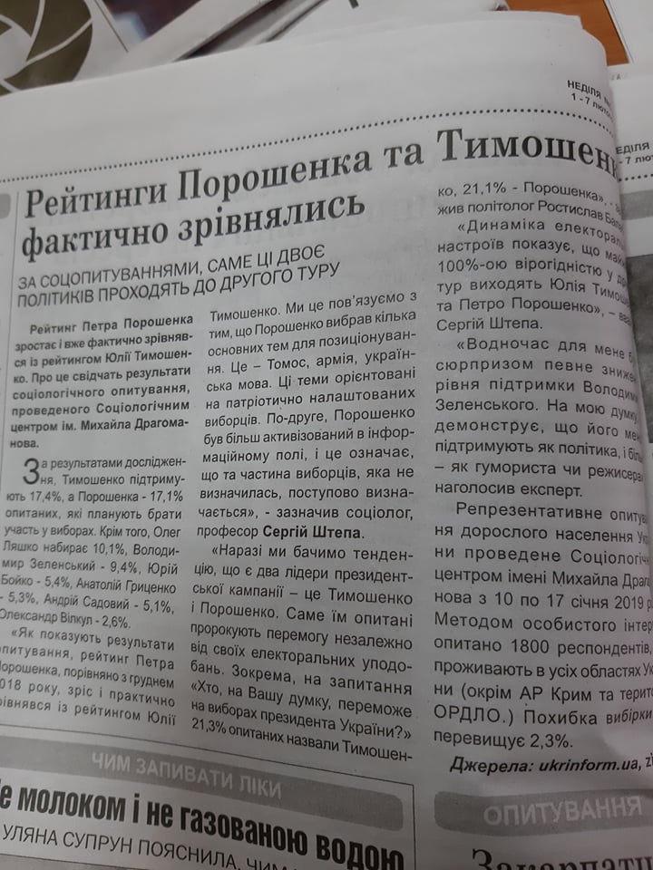 Видання «Неділя» у випуску від 1-7 лютого опублікувало на своїх сторінках свіжі дані «соціологічних опитувань», де йдеться, що рейтинги кандидатів Юлії Тимошенко та Петра Порошенка фактично зрівнялися і саме ці двоє політиків проходять до другого туру виборів. Згідно ч.1, 2 ст. 56-6 Закону України «Про вибори Президента України», соціологічні опитування мають оприлюднюватися у ЗМІ разом з інформацією про установу, яка здійснила опитування, замовників опитування, часу його проведення, території опитування, вибірку, метод опитування, точне формулювання питань, можливу похибку. У згаданому матеріалі вказано інституцію, яка проводила опитування, кількість респондентів, дату проведення та можливу похибку, однак питання, які ставили респондентам, не вказані.