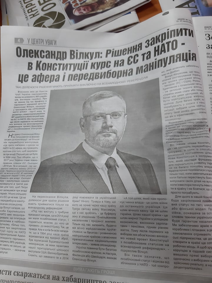 У виданні «Неділя» від 15-21 лютого розмістили публікацію із заголовком «Олександр Вілкул: рішення закріпити в Конституції курс на ЄС та НАТО – це афера і передвиборча маніпуляція».
